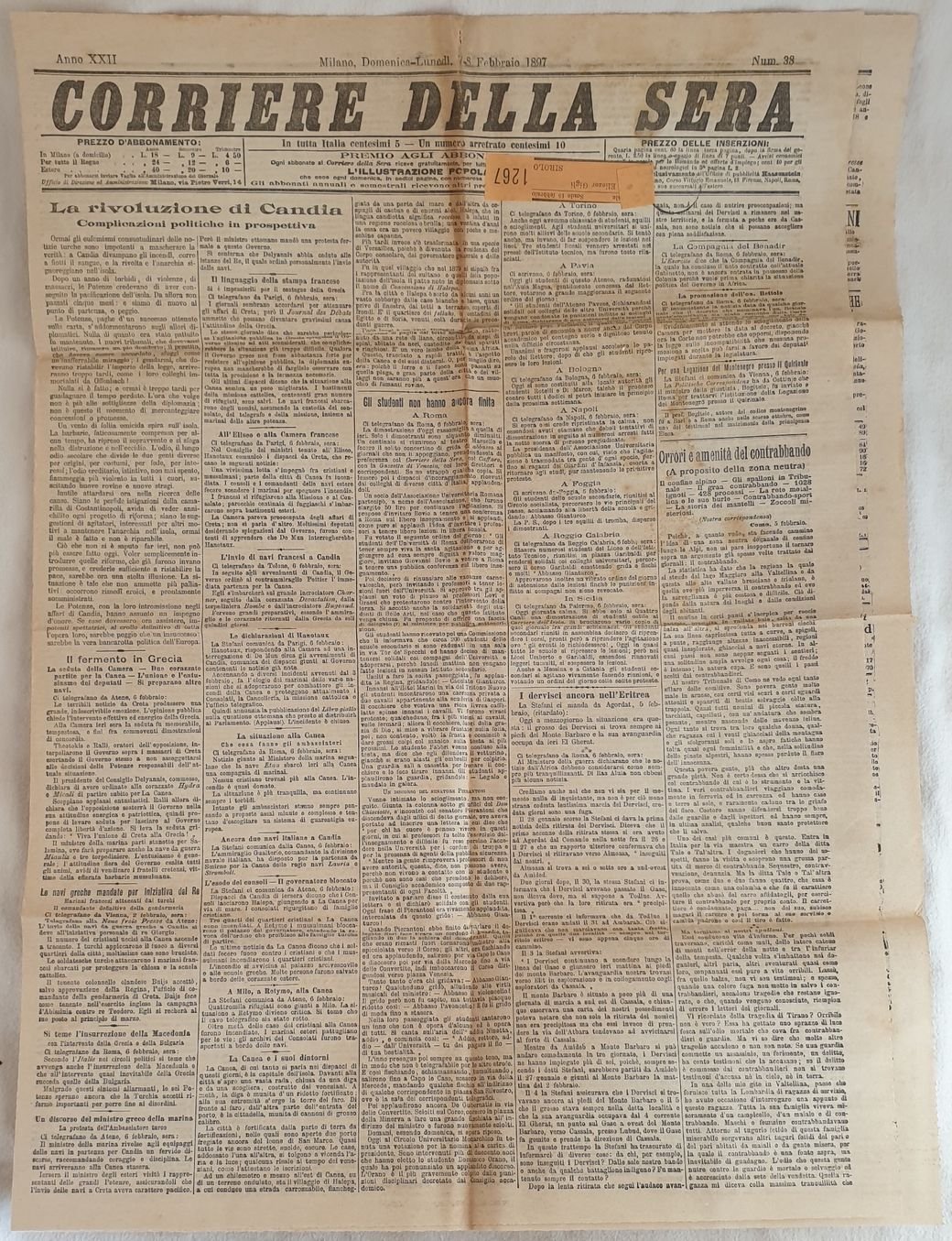 Numero del 7-8 febbraio 1897 di questo storico quotidiano italiano fondato a Milano nel 1876. Tra gli articoli presenti: La rivoluzione di Candia, Gli studenti non hanno ancora finito a Roma, Contrabbando, Eritrea, Lo sciopero dei facchini in Ancona, Necrologio il Generale Raffaele Cadorna, per i danneggiati di Sant'Anna ecc. Belle pubblicità. Etichette. In buone condizioni.Raro. Brossura editoriale in buone condizioni generali con lievi usure ai margini e dorso. Piegature. All'interno le pagine si presentano in buone condizioni con rare fioriture. Piegature ed usure marginali. In folio. Dim. 59,5x44 cm. Pp. 4.Number of the 7th 8th of february 1897 of this historical daily magazine established in Milan in 1876. The articles inside: Revolution of Candia, riot of students in Rome, Eritrea, Strike in Ancona, Death of General Raffaele Cadorna, for ruined people of Sant'Anna Beautiful advertisings inside. Labels. In good conditions.Scarce copy. Editorial cover in good general conditions slightly worn in the edges and spine. Foldings and wearings. Inside pages are in good conditions with occasional foxings. Foldings. In folio. Dim. 59,5x44 cm. Pp. 4.