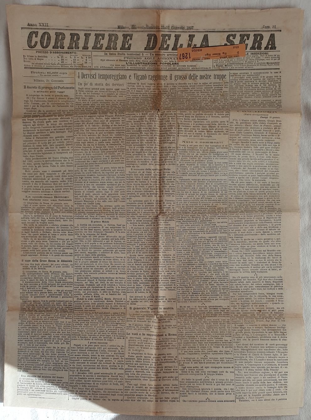 Numero del 21 22 gennaio 1897 di questo storico quotidiano italiano fondato a Milano nel 1876. Tra gli articoli presenti: I dervisci temporeggiano e Vigano raggiunge il grosso delle nostre truppe, La spedizione Bottego, Il capo della croce Rossa in Abissinia, Il generale Vigano in Marcia, Pro Ibsen, Ozanam, La tassa sulle biciclette, Il museo Cernuschia Parigi ecc. Belle pubblicità. Etichette. In buone condizioni.Raro. Brossura editoriale in buone condizioni generali con lievi usure ai margini e dorso. Piegature. All'interno le pagine si presentano in buone condizioni con rare fioriture. Piegature ed usure marginali. In folio. Dim. 59,5x44 cm. Pp. 4.Number of the 21st 22nd of january 1897 of this historical daily magazine established in Milan in 1876. Between the issues treated: dervisci takes time and Vigano gets our troops, Expedition Bottego, the head of Red Cross in Abissinia, The general Vigano, Pro Ibsen, Ozanam, Tax on bicicles, The Museum Cernuschia Parigi etc. In good conditions. Scarce copy. Editorial cover in good general conditions slightly worn in the edges and spine. Foldings and wearings. Inside pages are in good conditions with foxings. Foldings. In folio. Dim. 59,5x44 cm. Pp. 4.