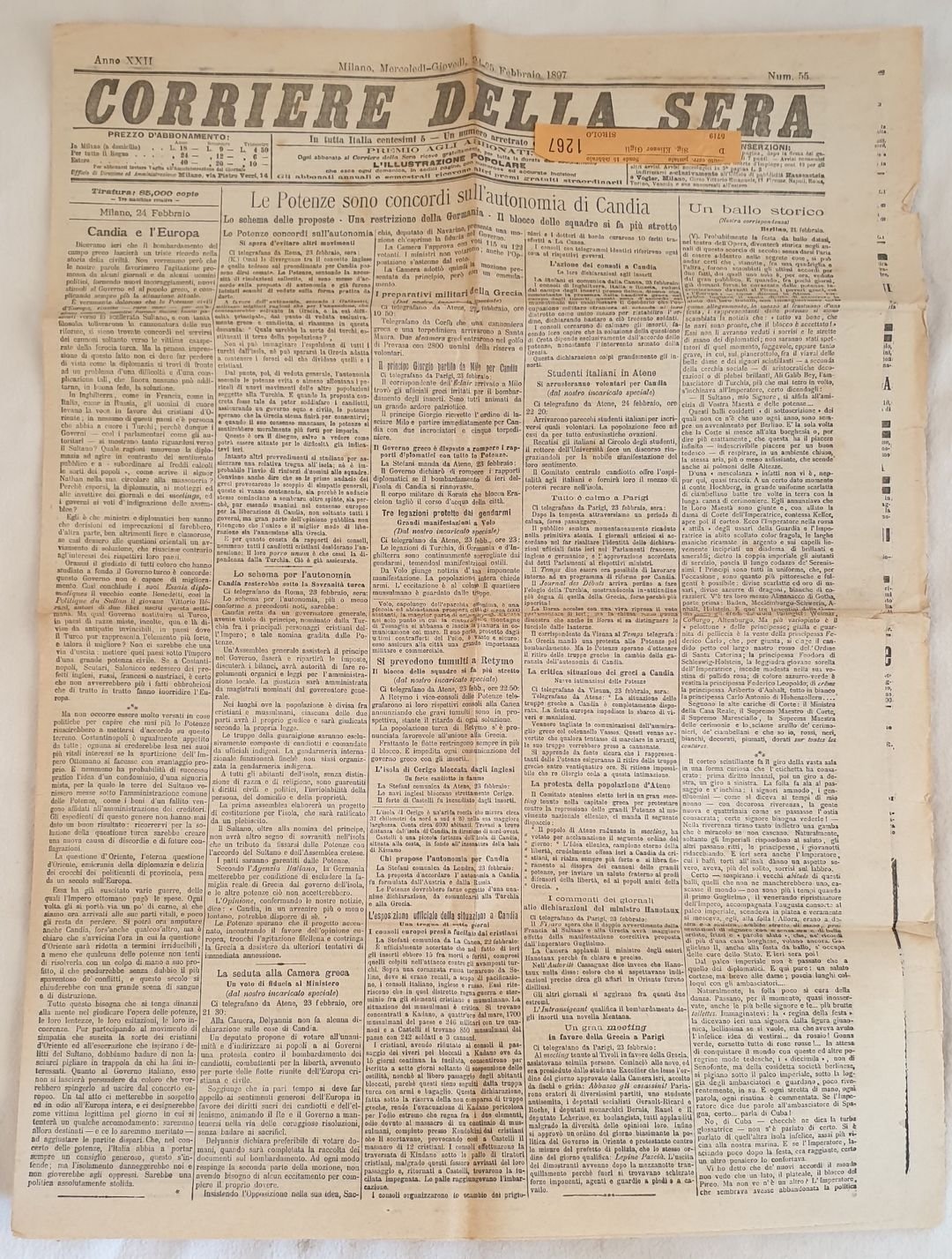 Numero del 24 25 febbraio 1897 di questo storico quotidiano italiano fondato a Milano nel 1876. Tra gli articoli presenti: Candia e l'Europa, Le potenze sono concordi sull'autonomia di Candia, Studenti italiani ad atene, Si prevedono tumulti a Retymo, Un gran meeting in favore della Grecia a Parigi, Intorno alle cose d'Oriente, La querela del Ministro Guicciardini, Sciopero dei salumieri a Milano ecc.Belle pubblicità. Etichette. In buone condizioni.Raro. Brossura editoriale in buone condizioni generali con lievi usure ai margini e dorso. Piegature. All'interno le pagine si presentano in buone condizioni con rare fioriture. Piegature ed usure marginali. In folio. Dim. 59,5x44 cm. Pp. 4.Number of the 24th 25th of february 1897 of this historical daily magazine established in Milan in 1876. Between the issues treated: Candia and Europe, Powerships agree about autonomy of Candia, Italian students in Athens,Riots in Retymo, A big meeting in in favour of greece in Paris, About Middle East things, The claim of Ministery Guicciardini, Strike of salumi sellers in Milan etc. In good conditions. Scarce copy. Editorial cover in good general conditions slightly worn in the edges and spine. Foldings and wearings. Inside pages are in good conditions with foxings. Foldings. In folio. Dim. 59,5x44 cm. Pp. 4.