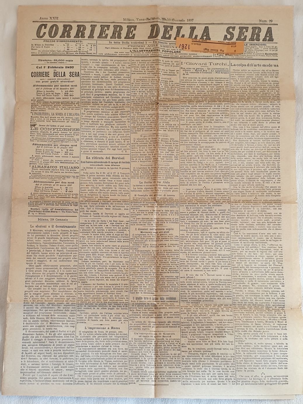 Numero del 29 30 gennaio 1897 di questo storico quotidiano italiano fondato a Milano nel 1876. Tra gli articoli presenti: La ritirata dei dervisci, I giovani turchi, La colpa dell'arte moderna, Anarchici italiani arrestati a Fiume, Un intervista sui prigionieri italiani in Abissinia, Consiglio comunale di Milano, Menelik giudicato dal conte Antonelli ecc. Belle pubblicità. Etichette. In buone condizioni.Raro. Brossura editoriale in buone condizioni generali con lievi usure ai margini e dorso. Piegature. All'interno le pagine si presentano in buone condizioni con rare fioriture. Piegature ed usure marginali. In folio. Dim. 59,5x44 cm. Pp. 4. Number of the 29th 30th of january 1897 of this historical daily magazine established in Milan in 1876. Between the issues treated: ythe young turkish, modern art, Iatlain anarchists arrested in Fiume, An interview about italian prisoners in Abissinia, Consiglio comunale di Milano, Menelik judges by Antonelli etc. In good conditions. Scarce copy. Editorial cover in good general conditions slightly worn in the edges and spine. Foldings and wearings. Inside pages are in good conditions with foxings. Foldings. In folio. Dim. 59,5x44 cm. Pp. 4.