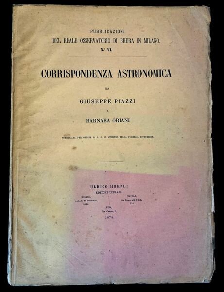 In folio; (4), 204 pp. Brossura editoriale con titolo impresso in nero al piatto anteriore. Qualche lieve segno del tempo e strappetto al margine esterno, senza perdita di carta, a fogli chiusi e nel complesso ancora in barbe ed in buone-ottime condizioni di conservazione. Prima non comune edizione di questa monografia dedicata alla corrispondenza astronomica dei due grandi astronomi italiani Giuseppe Piazzi (Ponte in Valtellina, 16 luglio 1746 Napoli, 22 luglio 1826) e Barnaba Oriani (Milano, 17 luglio 1752 Milano, 12 novembre 1832). Lopera raccoglie limportantissima corrispondenza che i due grandi astronomi tennero durante la loro vita. La loro corrispondenza è di enorme importanza per la storia dellastronomia per limportanza dei temi trattati. Si ricordi ad esempio la lettera con la quale Piazzi annunciava a Piazzi la scoperta di Cerere. Risultati delle osservazioni della nuova stella scoperta il dì primo gennaio allOsservatorio Reale di Palermo Palermo 1801. Già da nove anni travagliando io a verificare le posizioni delle stelle che si trovano raccolte ne vari Cataloghi degli astronomi, la sera del primo gennaio dellanno corrente, tra molte altre cercai la 87.a del Catalogo delle stelle zodiacali dellAbate La Caille. Vidi pertanto che era essa preceduta da unaltra, che secondo il costume, volli osservare ancora, tanto maggiormente, che non impediva losservazione principale. La sua luce era un poco debole, e del colore di Giove, ma simile a molte altre, che generalmente vengono collocate nellottava classe rispetto alla loro grandezza. Non mi nacque quindi alcun dubbio sulla di lei natura. La sera del due replicai le mie osservazioni, e avendo ritrovato, che non corrispondeva né il tempo, né la distanza dallo zenit, dubitai sulle prime di qualche errore nellosservazione precedente: concepii in seguito un leggiero sospetto, che forse esser potesse un nuovo astro. La sera del tre il mio sospetto divenne certezza, essendomi assicurato che essa non era Stella fissa. Nientedimeno, avanti di parlarne aspettai la sera del 4, in cui ebbi la soddisfazione di vedere, che si era mossa colla stessa legge che tenuto aveva nei giorni precedenti. Anche se le osservazioni di Piazzi lo portarono verso la scoperta di un nuovo pianeta, nelle pubblicazioni ufficiali, lautore fu molto più prudente ma la corrispondenza qui pubblicata, dimostra come contemporaneamente, il dibattito epistolare con Oriani, fosse molto vivo ed in esso si sbilanciasse molto di più che sui canali ufficiali: Avevo annunciato questa stella come una cometa, ma poiché non è accompagnata da alcuna nebulosità, e inoltre il suo movimento è così lento e piuttosto uniforme, mi è venuto in mente più volte che potesse essere qualcosa di meglio di una cometa. Prima rara edizione, un solo esemplare censito in ICCU. Rif. Bibl.: IT\ICCU\TO0\0627765.