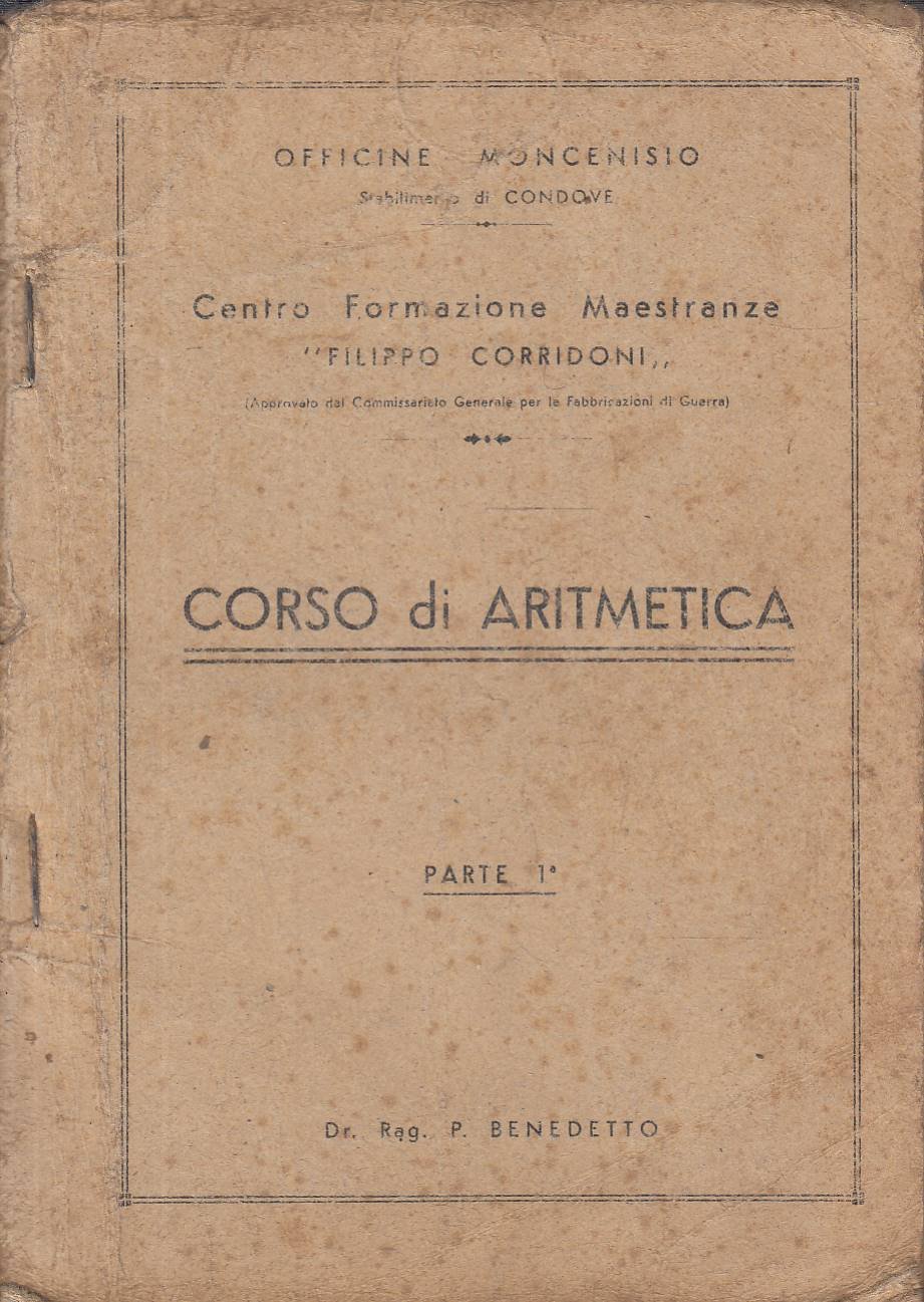 OFFICINE MONCENISIO, Stabilimento di CONDOVE, Centro Formazione Maestranze FILIPPO CORRIDONI (Approvato dal Commissariato Generale per le Fabbricazioni di Guerra). Brossura a punto metallico, 16x22 c, 100 pg. Dorso con lacune, buone condizioni.