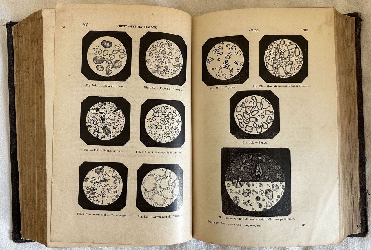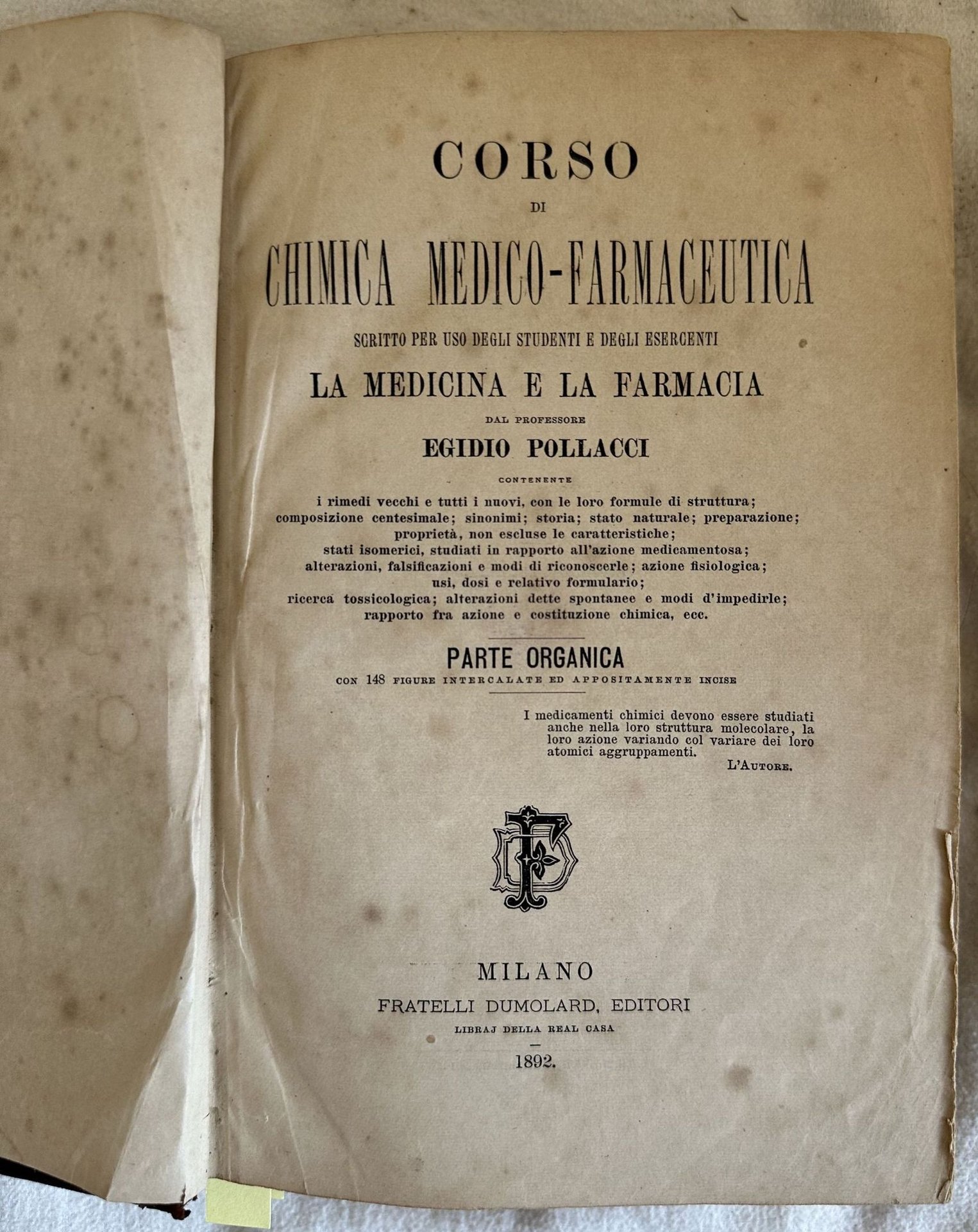 Edizione del 1892 di questo corso di chimica medico farmaceutica scritta da Egidio Pollacci. L'opera era composta da tre volumi, siamo in possesso del primo tomo solamente di chimica organica. Il volume è suddiviso in sessantadue lezioni tra cui: Principi organici, Idrocarburi e metano, Alcool, bevande fermentate e birra, acetoni, latatti, eteri, corpi grassi, sapori medicinali, fenoli, conina nicotina e sparteina, colchicina, ergotinina ecc. Numerose illustrazioni nel testo. In buone condizioni. Copertina in mezza pelle con titolo in oro al dorso in discrete condizioni generali con usure e ar margini e dorso. Dorso e cerniera anteriore riparate con nastro adesivo. Legatura in buone condizioni. Pagine in buone condizioni con rare fioriture. Dorso e cerniera anteriore riparate con nastro adesivo. In 8. Dim. 22,5x16. Pp. XXV+(1)+1174.Edition of 1892 of this course of medical farmaceutical chemistry written by Egidio Pollacci. The work was made up of three tomes, we only have the first one of organic chemistry. The volume is divided into 62 lessons between them Principi organici, Idrocarburi e metano, Alcool, bevande fermentate e birra, acetoni, latatti, eteri, corpi grassi, sapori medicinali, fenoli, conina nicotina e sparteina, colchicina, ergotinina ecc. Different illustrations in the text. In good conditions. Half leather cover with gilted title in the spine in poor conditions lightly worn in the extremities. Spine and front hidge repaired with adhesive tape. Binding in good conditions. Pages in good conditions with occasional foxing. In 8. Dim. 22,5x16. Pp. XXV+(1)+1174.