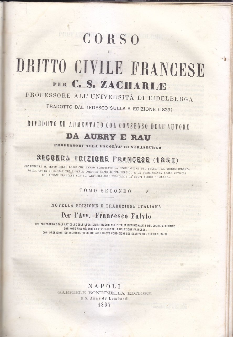 CORSO DI DIRITTO CIVILE FRANCESE per C. S. Zachariae riveduto e aumentato col consenso dell'autore da Aubry e Rau. Opera completa di 3 volumi rilegati insieme. Napoli, Gabriele Rondinella editore