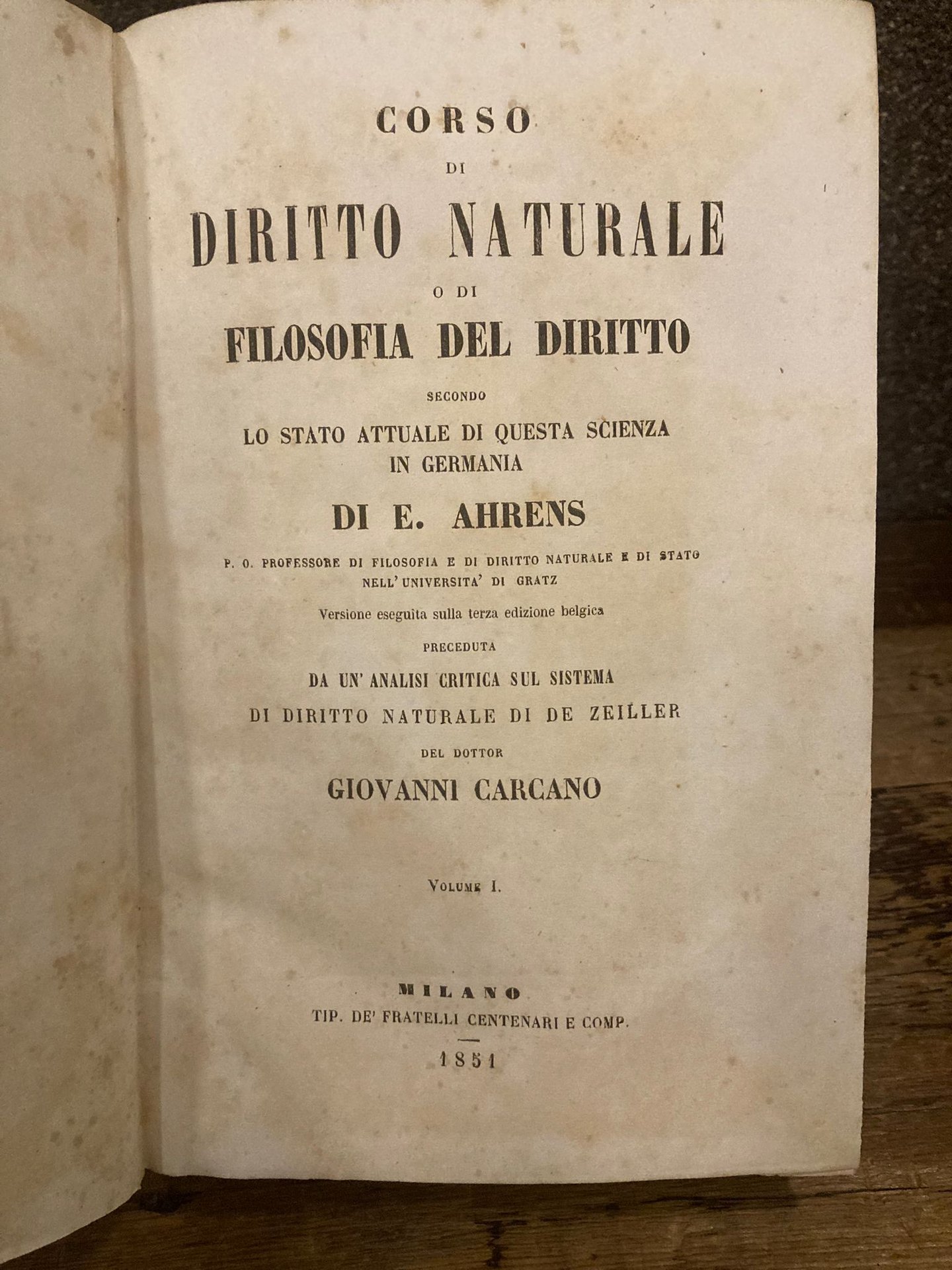 Corso di Diritto naturale o di filosofia del diritto secondo lo stato attuale di questa scienza in Germania. Versione eseguita sulla terza edizione belgica, preceduta da un'analisi critica sul sistema di diritto naturale di De Zeiller di Giovanni Carcano. Volumi: 1-2. Aggiuntavi una dissertazione su 'Il diritto di punire' del Prof. G. Giovanelli