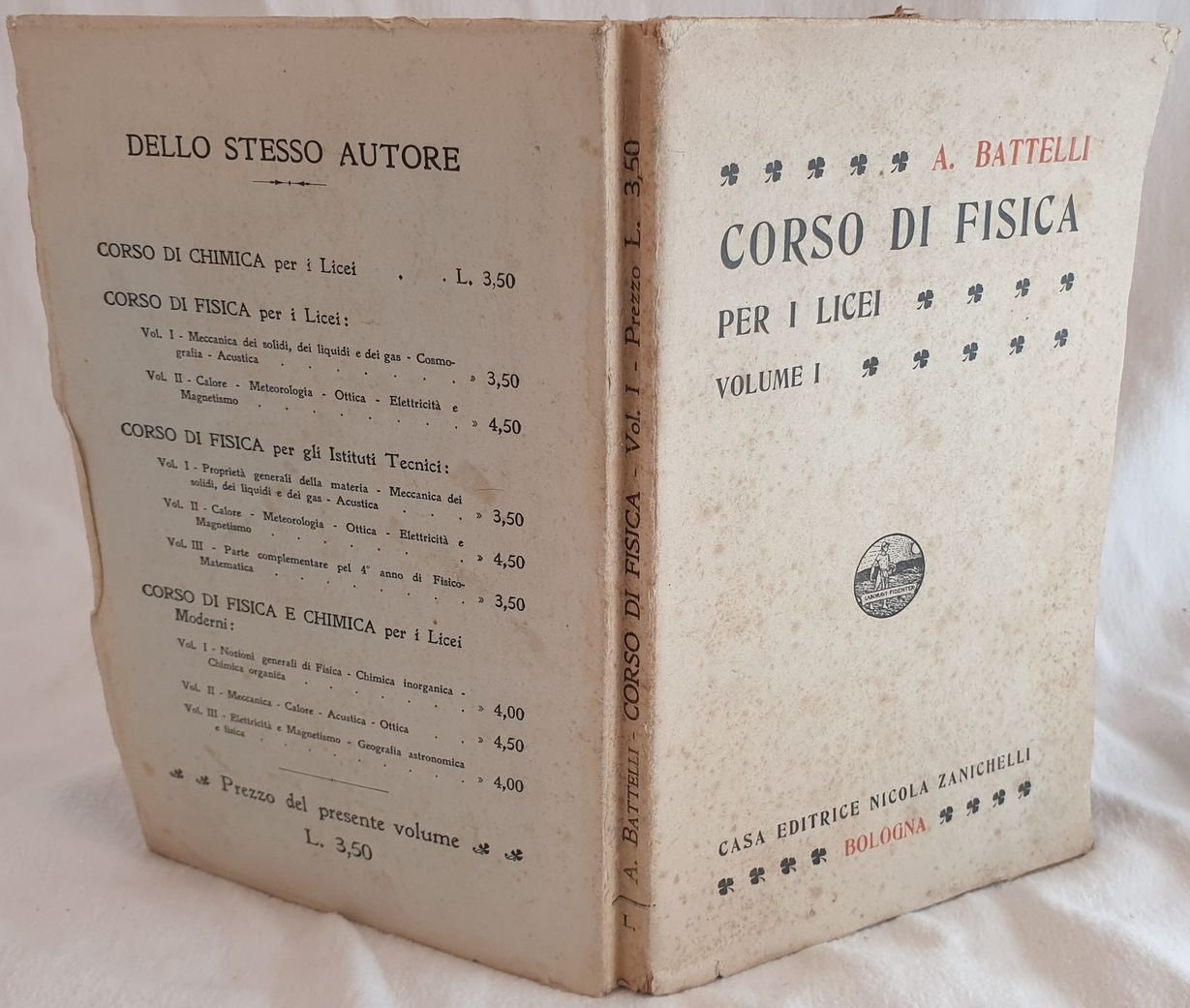 Edizione del 1914 di questa opera di fisica di Angelo Battelli (1862-1916) fisico politico e accademico italiano. Battelli vinse il concorso per la cattedra di fisica sperimentale insegnando prima a Cagliari, poi a Padova e infine a Pisa dal 1893. Tra gli argomenti trattati: cinematica, statica, macchine semplici, dinamica, lavoro ed energia, idrostatica, statica dei gas, azioni molecolari nei fluidi, cosmografia, acustica ecc. Numerose illustrazioni all'interno. In buone condizioni. Copertina editoriale in buone condizioni generali con lievi usure ai margini e dorso. Legatura in buone condizioni. All'interno le pagine si presentano in ottime condizioni con rare fioriture, ancora da rifilare. In 8. Dim. 22,5x14,5 cm. Pp. 264. Edition of 1914 of this work of physics by Angelo Battelli (1862-1916) italian physics politican and academical. Battelli won the concourse for cattedra of experimental physics tecaching in Cagliari, Padoa and Pisa from 1893. Inside mechanics, cosmography, acustics ecc. Different illustrations inside. In good conditions. Editorial cover in good general conditions slightly worn in the edges and spine. Binding in good conditions. Pages in very good condiitons with occasional foxings, still uncut. In 8. Dim. 22,5x14,5 cm. Pp. 264.