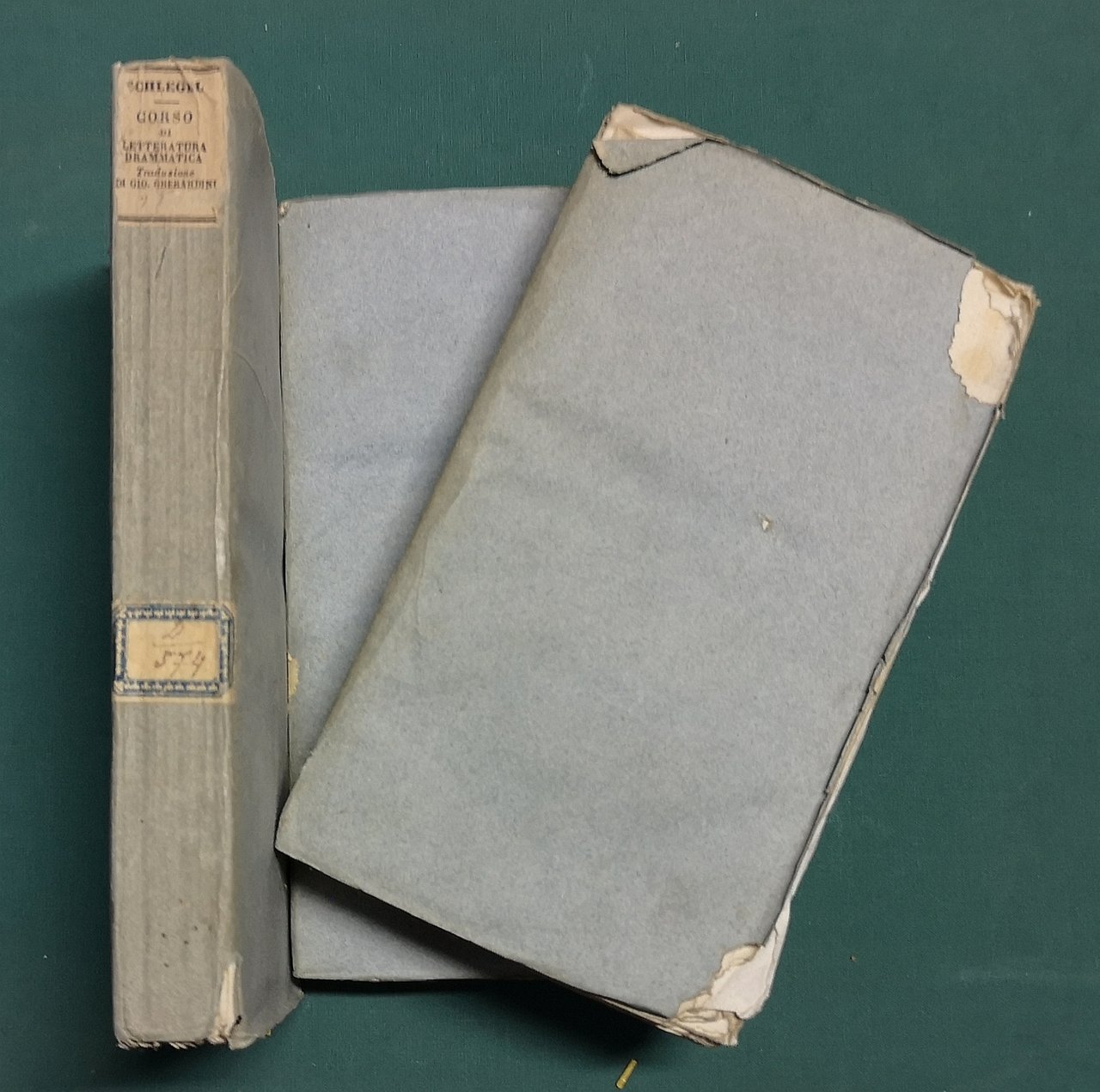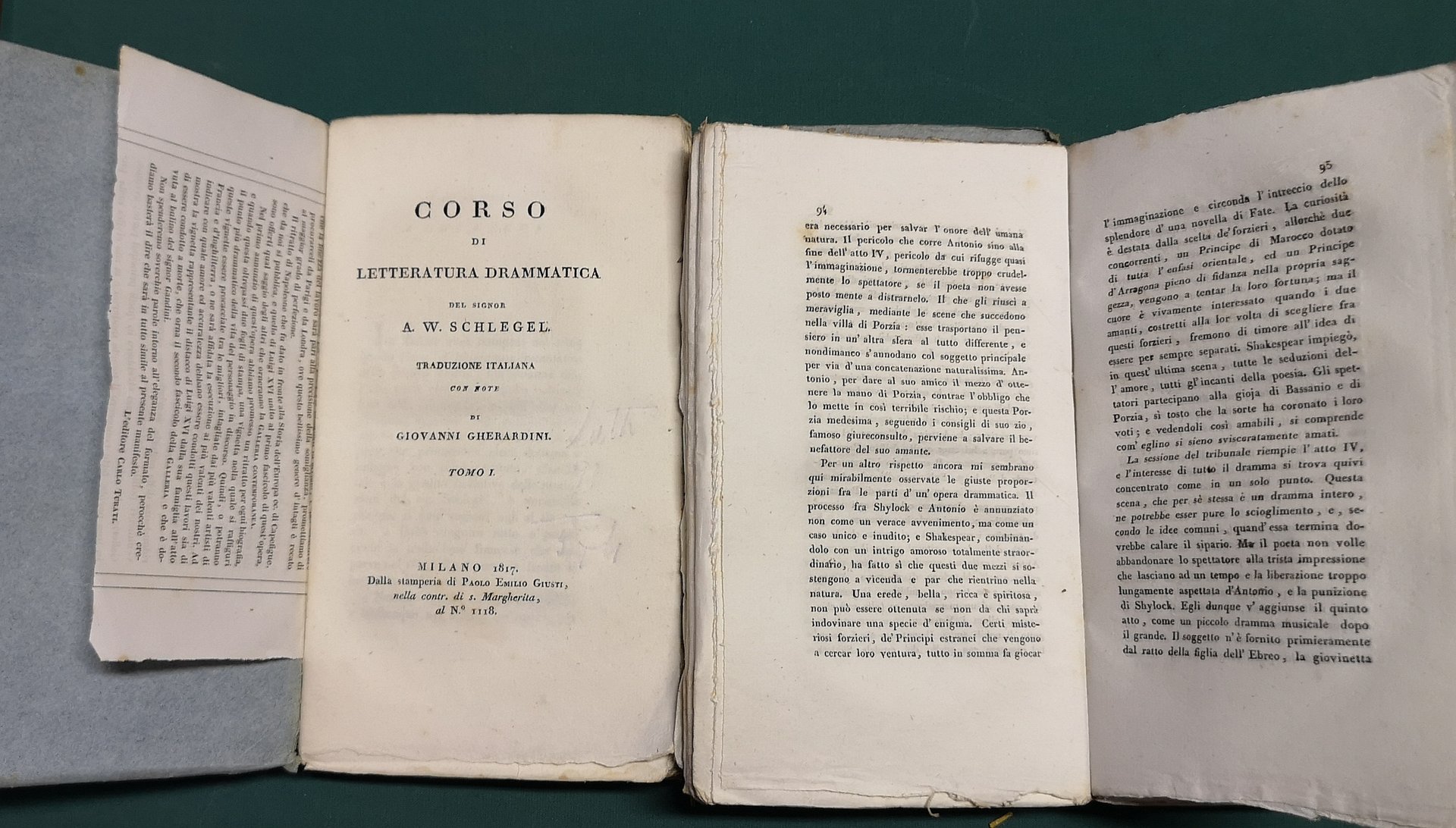 >in-8, pp. 360; 364, (2); 384, (4); broch. orig. mute. Prima edizione della traduzione italiana dell'opera, condotta sulla prima edizione francese che l'autore pubblicò rielaborando completamente, rispetto all'originale tedesca pubblicata ad Heidelberg nel 1809, il testo delle lezioni da lui tenute a Vienna l'anno precedente. È divisa in 12 lezioni sui teatri classici e 5 lezioni sui teatri romantici (in particolare italiano fino all'Alfieri, francese, spagnolo, inglese e tedesco), con utili indici degli autori e dei titoli delle composizioni teatrali trattate. Da subito essa s'impose all'attenzione di tutta Europa ''enunciando in forma chiara ed eloquente princìpi e idee...che allora erano nuove e ardite... e (in Italia) attraverso il Manzoni acquistò subito capitale importanza per gli sviluppi ulteriori della nostra letteratura'' (Diz. Bompiani II, 463). Giov. Gherardini (Milano 1778-1861) fu medico e filsofo e questa sua traduzione fece testo fra gli scrittori drammatici della scuola romantica. Bellissimo esemplare a pieni margini, con barbe.