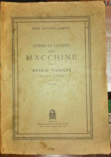 In-4 (25,5cm) VII 473 IV (di tavole). Brossura editoriale usurata e alcune tavole slegate. Capetti Antonio (1895-1970): ingegnere, docente universitario di macchine termiche e idrauliche, preside della Facoltà di ingegneria, poi rettore del Politecnico di Torino, vice presidente dell'Associazione tecnica dell'automobile. Nato a Fermo, morto a Torino.