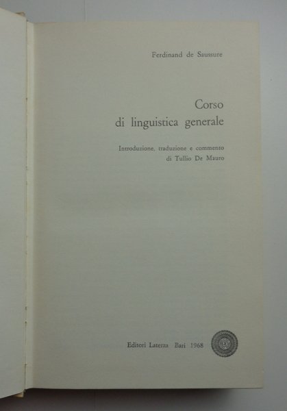Introduzione, traduzione e commento di Tullio De Mauro. Un volume (24 cm) di XXIII-491 pagine. Tela editoriale con sovracoperta illustrata, nella collana BCM. Difetti alla sovracoperta, con una gora e fioriture; peraltro l'interno in condizioni molto buone.