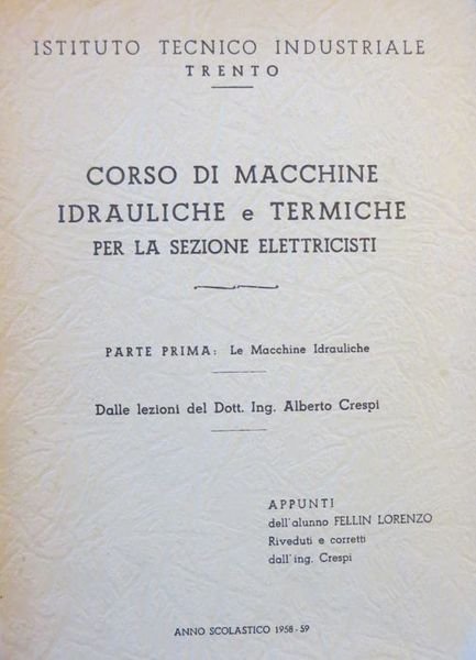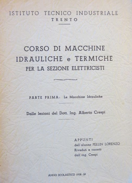 - Dalle lezioni del dott. ing. Alberto Crespi; appunti dell'alunno Fellin Lorenzo riveduti e corretti dall'ing. Crespi - Istituto tecnico industriale, Trento: anno scolastico 1958-59.