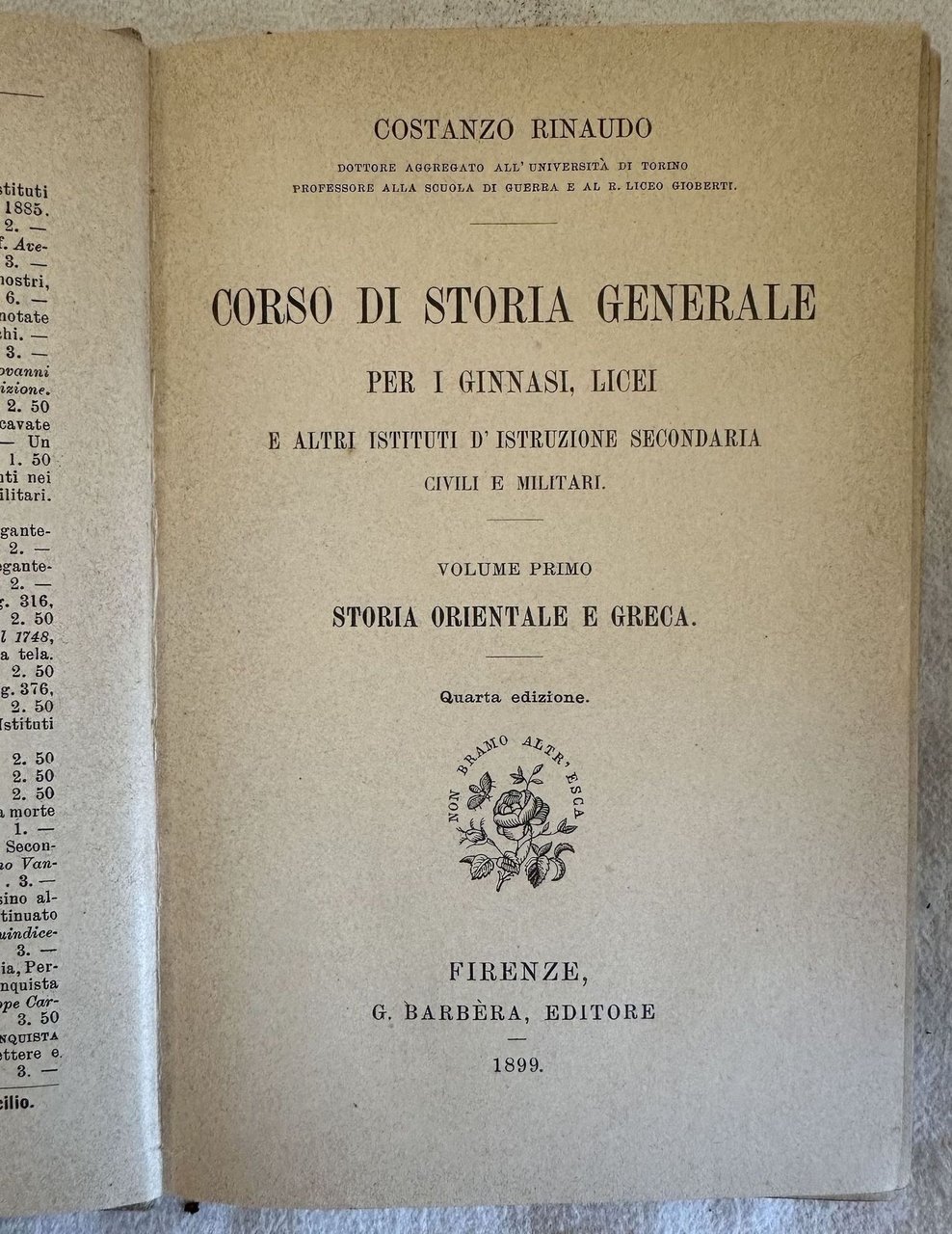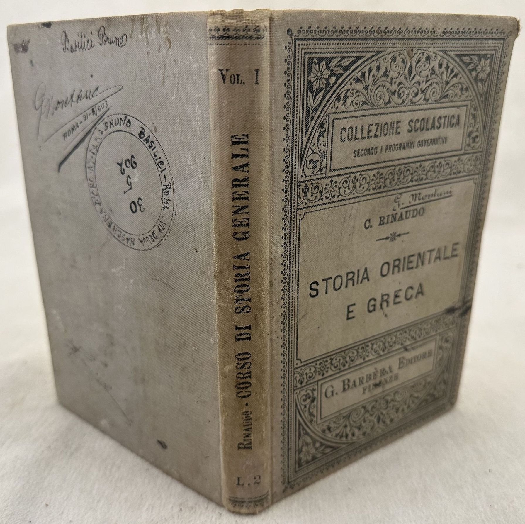 Edizione del 1899 di questo volume di storia generale per i ginnasi e licei scritto da Costanzo Rinaudo. Volume primo solamente di storia orientale e greca. All'interno: Storia Antica, Oriente (Egiziani, Ebrei e Fenici, Popoli dell'Asia Minore, Asiri e Babilonesi, Iranici, Indi), Grecia (Geografia e paesi limitrofi, Etnografia dei popoli greci, Trasmigazioni di popoli nella Grecia, Sparta, Solone, Maturità politica e civile della Grecia, Predominio di Sparta, Alessandro Magno ec.). In buone condizioni. Copertina in tela editoriale in buone condizioni con lievi usure marginali. Legatura in buone condizioni. Pagine in buone condizioni generali con fioriture. In 8. Dim. 19x12,5 cm. Pp. (4)+221.Edition of 1899 of this volume of general history for high school written by Costanzo Rinaudo. First volume only of oriental history and Greece. Inside: Storia Antica, Oriente (Egiziani, Ebrei e Fenici, Popoli dell'Asia Minore, Asiri e Babilonesi, Iranici, Indi), Grecia (Geografia e paesi limitrofi, Etnografia dei popoli greci, Trasmigazioni di popoli nella Grecia, Sparta, Solone, Maturità politica e civile della Grecia, Predominio di Sparta, Alessandro Magno ec.). In good conditions. Cloth editorial cover in good conditions lightly worn in the extremities. Binding in good general conditions. Inside pages are in good conditions with foxing. In 8. Dim. 19x12,5 cm. Pp. (4)+221.
