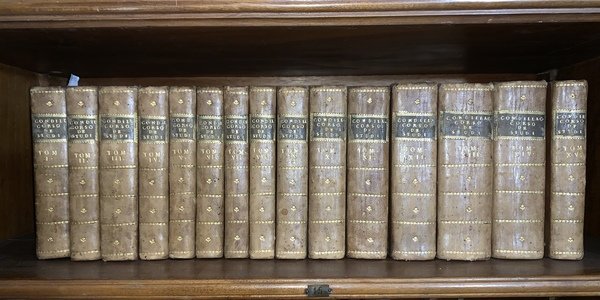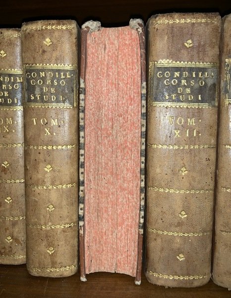 In 12° (17,5x9 cm); 574 pp., 452, (2) pp., 586, (2) pp., 420 pp., 345, (1) pp., 383 pp., 346 pp., 370 pp., 480 pp., 598 pp., 658 pp., 732 pp., 832 pp., 840 pp., 515, (1) pp. Belle legature coeve in mezza-pelle chiara con titolo su fascetta in pelle scura, numero del volume e fregi in oro al dorso. Piatti foderati con bellissima carta coeva a motivi geometrici in giallo e nero. Tagli spruzzati in rosso. Esemplare appartenuto, come da antica firma al frontespizio, a Monsignor Giuseppe Zacchia (originario di Vezzano Ligure) che all'epoca vice-legato pontificio a Ravenna fu poi elevato al ruolo di Cardinale nel 1845 da papa Gregorio XVI (si ricorda di lui anche una repressione anticarbonara e per aver respinto nel 1826 con le armi l'assalto carbonaro a Ripatronsone). Prima edizione italiana (uscita nelle Opere di Condillac in 22 volumi) completa del celebre filosofo, enciclopedista ed economista francese Étienne Bonnot de Condillac (Grenoble, 30 settembre 1715 - Beaugency, 3 agosto 1780). Qualche minima macchiolina di foxing ma nel complesso, opera in ottime condizioni di conservazione ed in bella legatura. Nacque a Grenoble da una famiglia di giuristi, e, come il fratello maggiore, il famoso scrittore politico, abate di Mably, prese l'ordine sacro e divenne abate di Mureau. In entrambi i casi la professione era solo nominale, e l'intera vita di Condillac, con l'eccezione del periodo in cui fu tutore alla corte di Parma, si dedicò ai suoi studi. Le suo opere furono Saggio sull'origine delle conoscenze umane (1746), Trattato sui sistemi (1749), Trattato sulle sensazioni (1754), Trattato sugli animali (1755), un completo Corso di studi (1767-1773) in 13 volumi, scritti per il giovane Duca Ferdinando di Borbone, nipote di Luigi XV, Il commercio e il governo, considerati l'uno relativamente all'altro (1776), e due lavori postumi, la Logica (1781) e l'incompleto Linguaggio dei calcoli (1798). Nei primi giorni a Parigi venne in contatto con la scuola di Diderot. L'amicizia con Rousseau, che durò fino alla morte, può essere dovuta in primo luogo al fatto che Rousseau era stato insegnante privato nella famiglia dello zio di Condillac, M. de Mably, a Lione. Grazie alla sua naturale attenzione e riservatezza, le amicizie di Condillac con i filosofi contemporanei non danneggiarono la sua carriera; egli comprese certamente la scelta della corte francese di mandarlo a Parma per educare il duca orfano, un bambino di sette anni, nel 1758. Nel 1768, dopo il suo ritorno dall'Italia, fu eletto all'Académie française, ma non partecipò alle riunioni dopo la sua elezione. Spese gli ultimi anni ritirandosi a Flux, una piccola proprietà che acquistò vicino a Beaugency, e vi morì il 3 agosto 1780. Condillac fu sia un importante psicologo sia un divulgatore in Francia dei principi di Locke, che fu apprezzato e riconosciuto soprattutto da Voltaire e Brissot . Nell'esporre il suo sensismo empirico, Condillac dimostrò di essere uno dei pensatori migliori del suo periodo e della sua nazione, per lucidità, sintesi, ponderazione. Il suo pensiero, tuttavia, nell'analisi della mente umana, vertice della sua ricerca, mancò di trattare la parte attiva e il lato spirituale dell'esperienza umana. Il suo primo libro, il Saggio sull'origine delle conoscenze umane, rimase fedele al suo maestro inglese. Egli accettò, con qualche modifica, la deduzione di Locke che la nostra conoscenza derivi da due sorgenti, la sensazione e la riflessione, e usò come principio cardine per la dimostrazione di questa tesi l'associazione delle idee. Il suo libro successivo, il Trattato sui sistemi, fu una vigorosa critica a quei moderni sistemi che erano basati su principi astratti o su ipotesi non verificate. La sua polemica, che fu legata allo spirito di Locke, fu diretta contro le idee innate dei cartesiani, dell'occasionalismo di Malebranche, del monadismo di Leibniz e dell'armonia prestabilita e, soprattutto, contro la concezione della sostanza enunciata nella prima parte dell'Etica di Spinoza. Nel trattato "sostiene che il ragionamento consiste nella sostituzione di un'affermazione con un'altra che sia identica; espone la scienza come un linguaggio ben costruito, un'affermazione che nel suo Linguaggio dei calcoli cerca di dimostrare con l'esempio dell'aritmetica. La sua logica ha in effetti buoni e cattivi punti che noi ci potremmo aspettare di trovare in un sensazionista che non conosce la scienza ma la matematica. Egli rigetta l'impianto medievale del sillogismo; ma si preclude dal suo punto di vista dal capire il carattere attivo e spirituale del pensiero; né ha avuto quell'interesse nella scienza naturale e nell'apprezzamento del ragionamento induttivo che fu la base del principale merito di J.S. Mill. È abbastanza evidente che la psicologia anti-spiritualistica di Condillac, con la sua spiegazione del personalità come un aggregato di sensazioni, conduce direttamente all'ateismo e al determinismo. Non c'è, tuttavia, motivo di interrogarsi sulla sincerità con cui ripudiò entrambe le conseguenze. Quello che dice sulla religione è sempre in armonia con la sua professione; e ha rivendicato la libertà di esserlo nella dissertazione che ha poco in comune con il Trattato sulle sensazioni con il quale è collegato. Il comune rimprovero del materialismo dovrebbe certamente non essere fatto contro di lui. Lui ha sempre asserito la sostanziale realtà dell'anima; e nelle parole iniziali del suo Saggio, "Comunque se noi saliamo in paradiso, o se scendiamo all'inferno, noi non usciremo mai da noi stessi - è sempre nostra la possibilità di percepire", noi ritroviamo quel soggettivismo che costituisce l'elemento centrale della filosofia di Berkeley.". Prima edizione italiana in ottime condizioni di conservazione, raro a trovarsi completo.