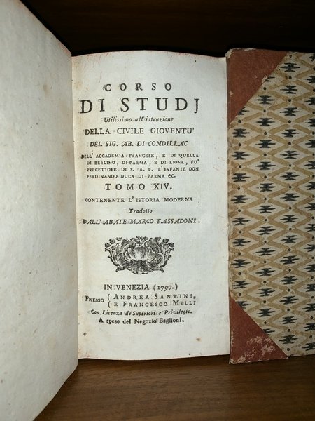 Corso di studj utilissimo all'istruzione della civile gioventù Del Sig. Ab. Di Condillac dell'Accademia Francese, e di quella di Berlino, e di Lione, fu precettore di S. A. R. l'Infante Don Ferdinando Duca di Parma ec. Tomo I - XVI (Completo).