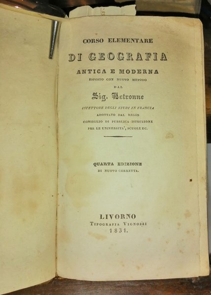Corso elementare di geografia antica e moderna esposto con nuovo metodo dal sig. Letronne, ispettore degli studi in Francia, adottato dal Regio Consiglio di Pubblica Istruzione per le università, scuole, ec. Quarta edizione di nuovo corretta.