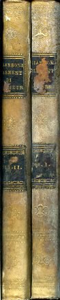 3 voll. in 2 tomi in-8°, pp. 222, (2); (4), 156, (4); 56; legatura coeva p. pergamena con titolo e tomaisons in oro su doppio tassello in pelle granata ai dorsi. 5 tavv. ripiegate f.t. con numerose figure al loro interno. Macchie e tracce d'uso alle pergamene. Sparse fioriture e tracce d'umido. Discreto stato complessivo. Le 'Note per servire di complemento' sono impresse a Roma dalla Stamperia di Filippo e Nicola De Romanis. Il Giamboni (Perugia, 1771-Vienna, 1832), clerico regolare di San Paolo, fu professore di matematica al Collegio Barnabita di Macerata e poi, dopo un viaggio durato svariati anni nel Nord America, all'Università di Perugia. Poggendorff, I, col. 891.