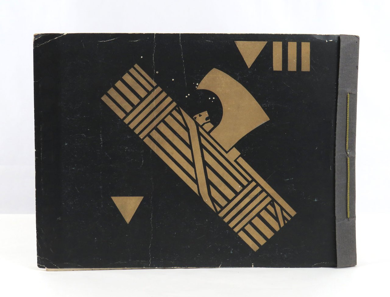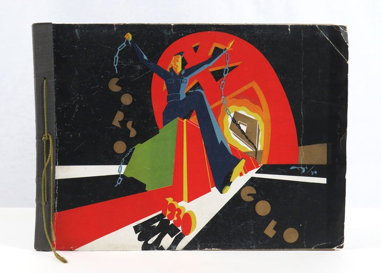LIBROEdizione originale e unica.Ottimo esemplare (lievi tracce di pieghe e piccoli urti alla copertina, come normale).Straordinaria qualità grafica, con moltissimi rimandi all’avanguardia futurista — «Ti - Ta - Ta - Ta - Buuum», teatro sintetico, dinamismo, parole in libertà, aeroplani e aeropittura, «Nitroglicerina», «Hollywood», «L’uomo elettrico» e addirittura un robot — per questo «Mak π 100» goliardico prodotto dalla classe 1927 della Regia Accademia Aeronautica. Fondata nel 1923, a ogni classe venne assegnato un nome principiante per una lettera in ordine alfabetico, dall’«Aquila» del 1923 a «Eolo» del 1927 e così via. Dal 1927 al 1943 l’accademia ebbe sede presso la Reggia di Caserta. Le impressionanti illustrazioni di copertina e molte delle tavole interne, impresse a più colori o in monocromo variante per ogni pagina, in sottoimpressione, sono firmate «[alfa] gi / 30», sigla che non siamo stati in grado di sciogliere. Solo quattro esemplari censiti in ICCU, in fondi specialistici (Archivio storico Bologna, Civiche raccolte Milano, Civica Torino e Fondazione Gramsci).