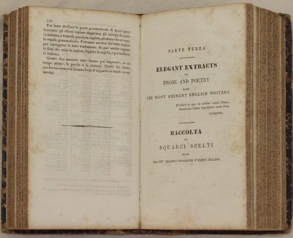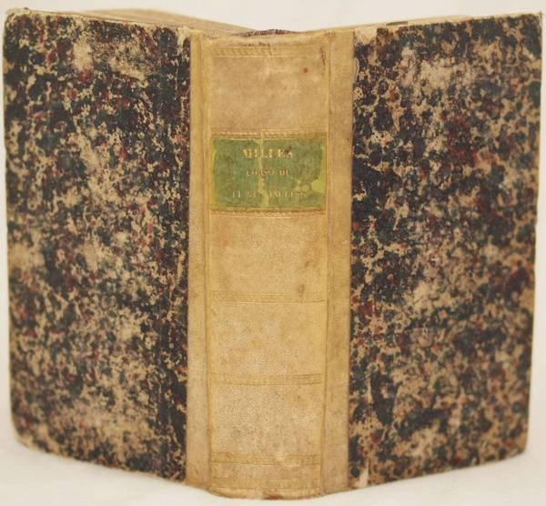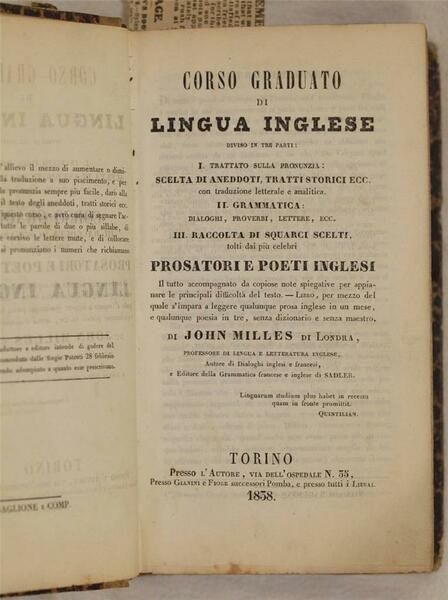 In 8. Dim. 19x10,5 cm. Pp. XVI+793+(3). Edizione del 1838 di questo corso di lingua inglese di John Milles professore di lingua e letteratura inglese a Londra. All'interno trattato di pronunzia, scelta di aneddoti e brani storici con traduzione a fronte, Grammatica, una raccolta di brani scelti di autori celebri (Blair, Watts, Leland, Robertson, Hume, Aikin, Moore, Franklin, Hawkesworth, Kelley, Sterne, Goldsmith, Milton, Watts, Cowper, Thomas Moore, Shakespeare, Cowper, Pollock ecc.) con note. Bella legatura in mezza pergamena coeva con titolo in oro su tassello e decorazioni. In buone condizioni. Copertina in mezza pergamena con titolo in oro su tassello al dorso e decorazioni in ottime condizioni generali con lievi usure ai margini e dorso. Legatura in buone condizioni. All'interno le pagine si presentano in buone condizioni con fioriture. Edition of 1838 of this course of english language by John Milles teacher of english language and litterature in London. Inside treaty of pronounciation, choice of anecdotes and historical texts with italian translation, Grammar, a collection of chosen texts of chosen authors (Blair, Watts, Leland, Robertson, Hume, Aikin, Moore, Franklin, Hawkesworth, Kelley, Sterne, Goldsmith, Milton, Watts, Cowper, Thomas Moore, Shakespeare, Cowper, Pollock ecc.) with notes. Beautiful half parchemnt cover with golden title and decorations in the spine. In good conditions. Half parchemnt coeval cover with golden title and decorations in very good general conditions slightly worn in the edges and spine. Binding in good conditions. Inside pages are in good conditions with foxings.