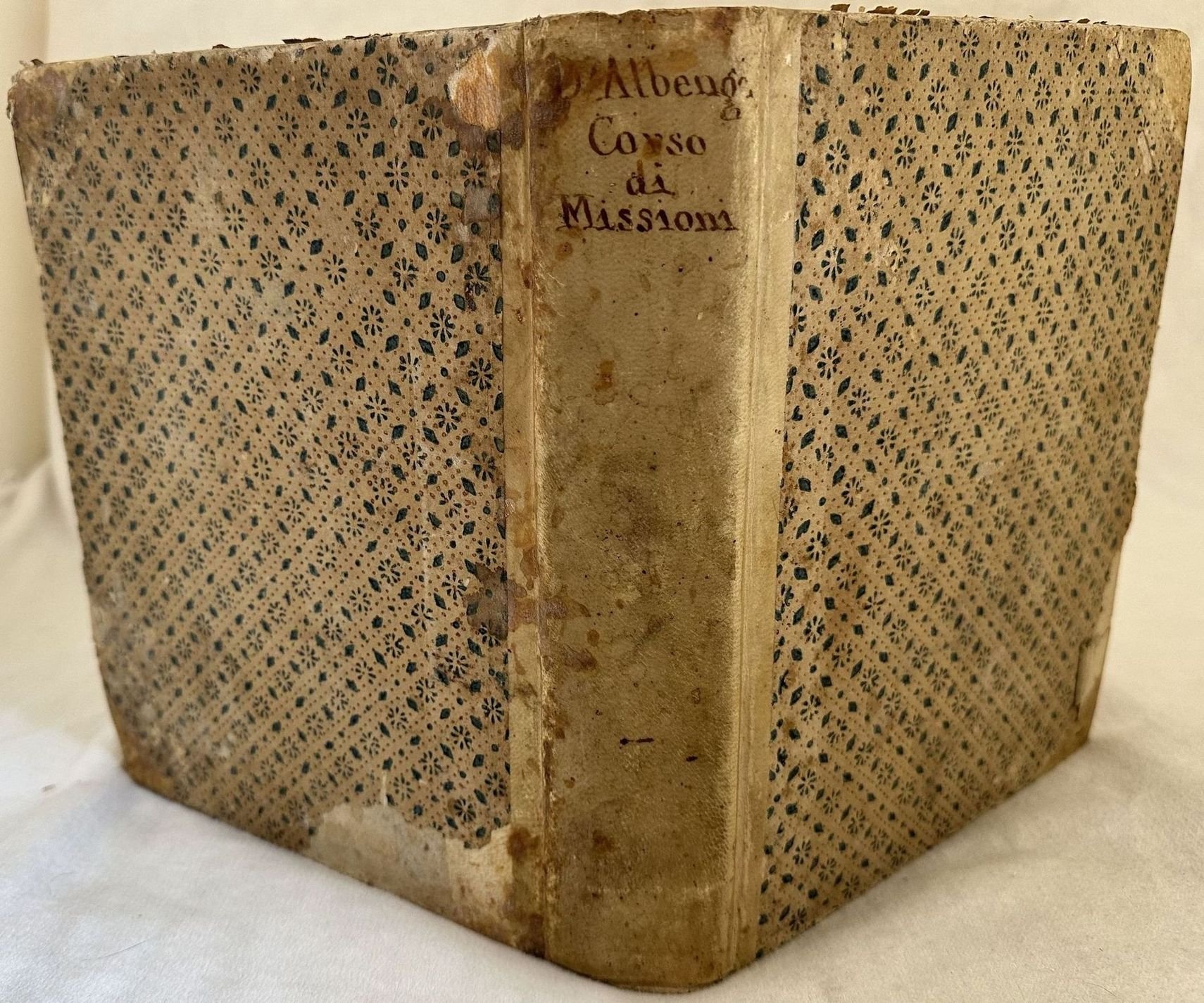 Edizione veneziana del 1804 di questa opera religiosa scritta da Claudio della Pieve d'Albenga Missionario cappuccino originario di Pieve di Teco (IM). L'opera, un successo all'epoca, contiene una serie di prediche, dialoghi e discorsi per ogni giorno del mese. Tra le prediche presenti: Esame dei peccati; per abbattere il rossore nel confessarsi, sopra il modo di confessarsi, Peccati di pensiero; Sopra le scuse; Sopra lo scandalo; Obblighi dei maritati; Educazione dei figliuoli; Sopra il rispetto dovuto alle Chiese; Sopra l'abuso di amoreggiare e conversare alla moda ecc. In buone condizioni. Copertina in mezza pergamena coeva con titolo manoscritto al dorso in buone condizioni general con lievi usure marginali. Legatura in buone condizioni. Pagine in buone condizioni con rare fioriture. In 8. cm 25,5x20,5. Pp. XIX+(1)+628.
