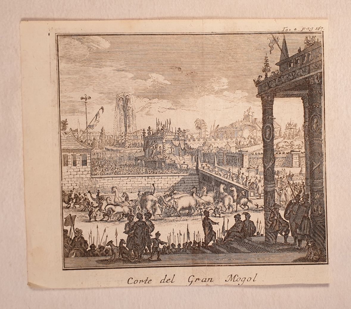 Planche estratta da libro che mostra la Corte del Gran Mogol. Atlante: Lo stato presente di tutti i popoli del mondo 1737-50 Data: 1750 circa Tecnica: incisione su rame Dimensione del foglio: 18,5x22 cm Dimensione incisione: 16,5x18,5 cm Condizioni: Buone. Alcune fioriture. Print representing a scene showing the Court of Great Mogol. Atlas: Lo stato presente di tutti i popoli del mondo 1737-50 Date: 1750 circa Technique: Copper etching Leaf Dimension: 18,5x22 cm (7.3x8.7 inches) Engraving Dimension: 16,5x18,5 cm (6.5x7.3 inches) Conditions: Good conditions. Some foxing.