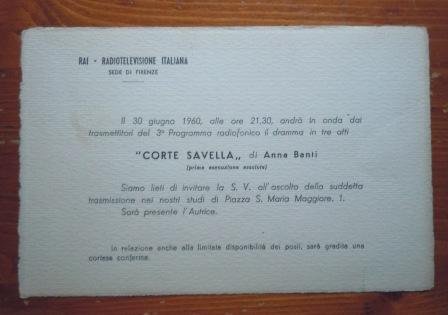 Si unisce cartoncino della RAI sede di Firenze, alla presentazione in prima esecuzione assoluta del dramma Corte Savella, in data 30 giugno 1960, sarà presente l'autrice.