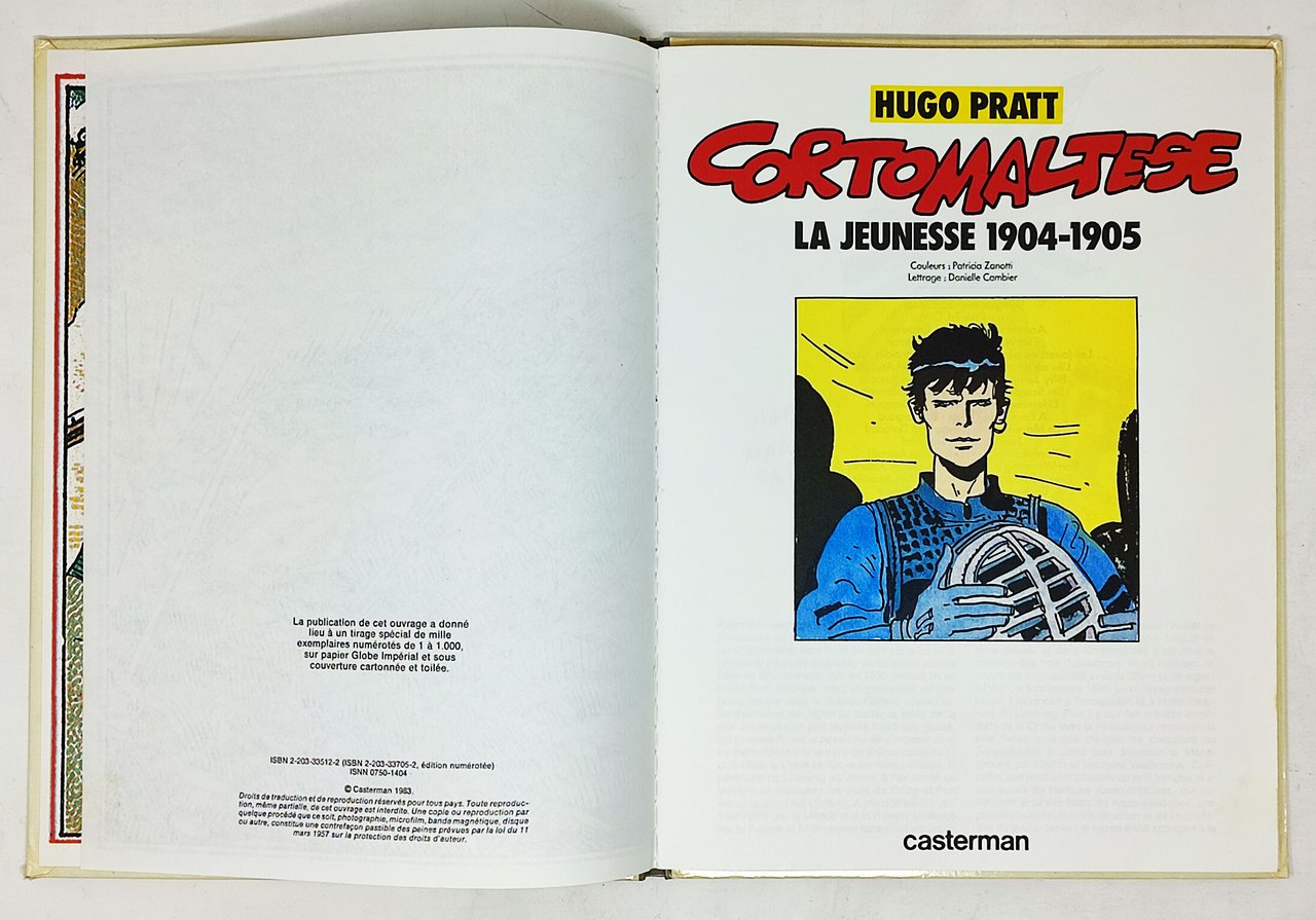 CORTO MALTESE / LA JEUNESSE 1904-1905. Couleurs: Patricia Zanotti. Lettrage: Danielle Cambier. Anno: 1983 (imprimé en Belgique, mars 1983 / Dépot legal: mai 1983). Lingua del testo: francese. Illustrato a colori. 44 pagine. Dimensioni: 23 x 30,5 cm circa. Stato di conservazione: spigoli inferiori del piatto anteriore leggermente consumati, bordo inferiore e superiore del piatto anteriore leggermente ingiallito ma, nel complesso, un esemplare decisamente buono. Interno fresco. Nessuna scritta o segno a matita o a penna nel testo. Copertina cartonata rigida, illustrata a colori.