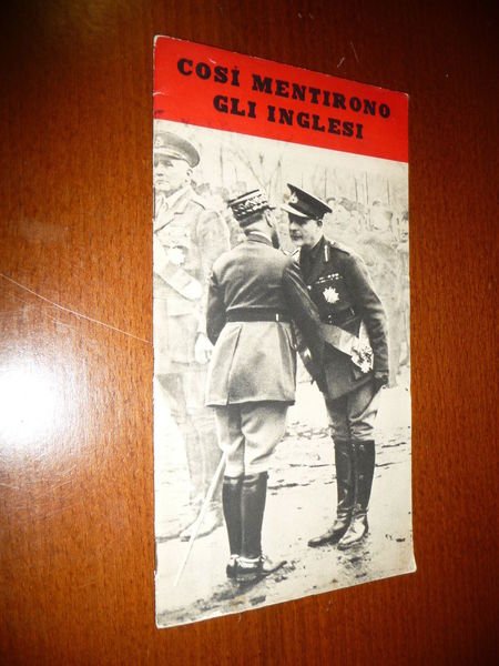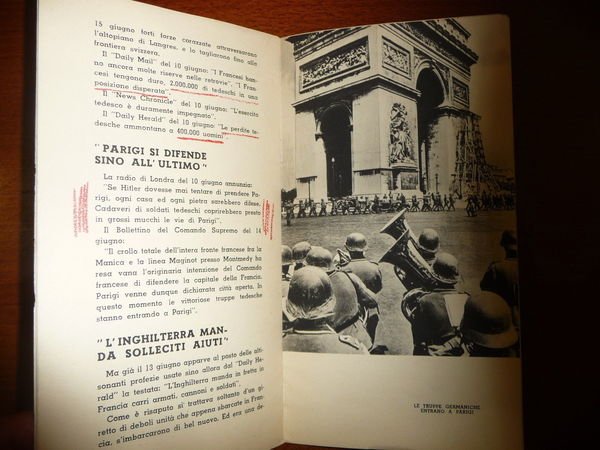 DESCRIZIONE: S.A. Istituto di Arti Grafiche Tumminelli Roma s.d. ma 1940, br. ed. ill. pp. 20 con diverse ill. b/n n.t., in 16°. Volume di propaganda contro gli inglesi, che contesta le notizie fornite da parte inglese, in merito allo svolgimento della campagna di Francia svolta dalle forze tedesche. Indice completo in foto. CONDIZIONI: Buone/Ottime, il vol. è appartenuto ad uno studioso, che ha sottolineato in matita rossa, tutti i passi difformi da quanto realmente accaduto, come da foto. PESO / WEIGHT: 34 gr. without package