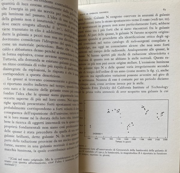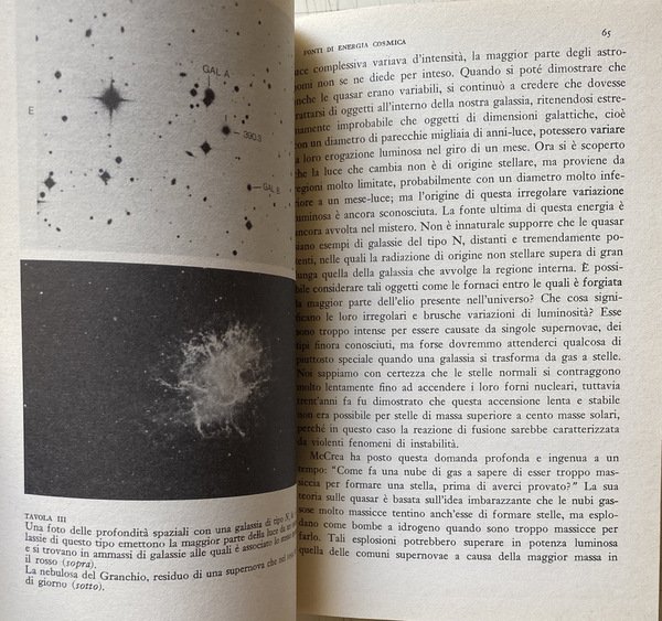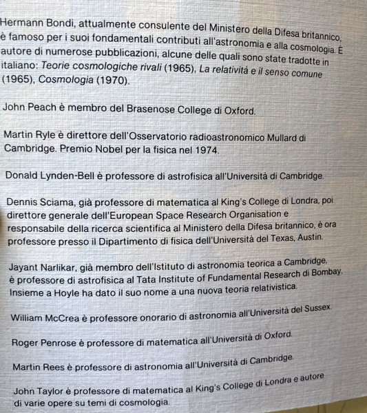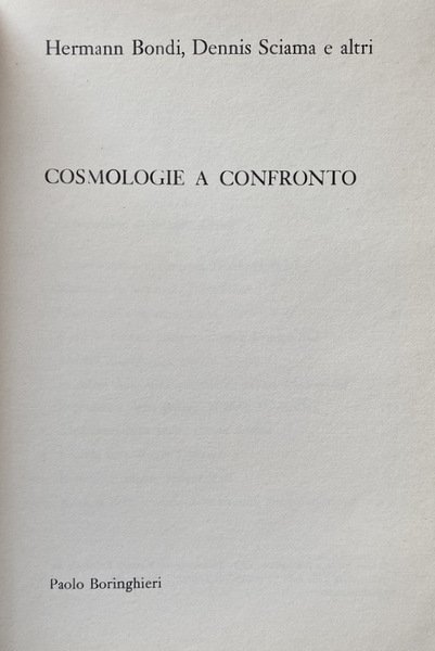 Soggetti: Cosmologia, Scienza, Fisica, Astronomia, Astrofisica, Tavola rotonda, Scienziati, Dibattiti, Problemi scientifici, Filosofia, Scienze, Origine, Formazione, Universo, Teorie cosmologiche rivali, Energia cosmica, Relatività, Stato stazionario, Galassie, Stelle, Sole, Terra, Buchi neri, Complessità, Anni Settanta, Critica, Interpretazione, Onde gravitazionali, Weber, Osservazioni, Penzias, Radiazione, Problema cosmologico, Lunghezze d'onda, Microonde, Distanza, Temperatura, Misure, Red Shift, Magnitudine, Decelerazione, Einstein, Newton, Hubble, Rosso, Blu, Neutro, Violetto, Palomar, Radiogalassie, Scoperte scientifiche, Quasar, Quasi-stelle, Raggi X, Satelliti, Prove sperimentali, Popper, De Sitter, Equazioni, Movimento, Fritz Zwicky, Espansione, Olbers, Luce, Luminosità, Nebulose, Andromeda, Telescopio, Chioma di Berenice, Evoluzione, Pensiero scientifico, Concezioni, Principi, Posizioni, Spazio, Supernovae, Elio, Gas, Idrogeno, Elettromagnetismo, Gravitazione, Elettroni, Oscillazioni, Pulsar, Spirale, Diagrammi, Grafici, Libri Vintage Fuori catalogo, Bibliografia, Riferimento, Consultazione, Fred Hoyle, Esplosione, Materia, Controversie, Leggi fisiche, Anni Cinquanta, Anni Sessanta, Thomas Gold, Nebulosa del Granchio, Meccanica quantistica, Infinito, Cosmology, Science, Physics, Astronomy, Astrophysics, Round Table, Scientists, Debates, Scientific problems, Philosophy, Sciences, Origin, Education, Universe, Rival cosmological theories, Cosmic energy, Relativity, Steady state, Galaxies, Stars, Sun, Earth, Black holes, Complexity, Seventies, Critical, Interpretation, Gravitational waves, Observations, Radiation, Cosmological problem, Wavelengths, Microwave, Distance, Temperature, Measurements, Magnitude, Deceleration, Red, Blue, Neutral, Violet, Radio galaxies, Scientific discoveries, Quasars, Quasi-stars, X-rays, Satellites, Experimental tests, Equations, Movement, Expansion, Olbers, Light, Luminosity, Nebulae, Telescope, Berenices, Evolution, Scientific fish, Conceptions, Principles , Positions, Space, Supernovae, Helium, Gas, Hydrogen, Electromagnetism, Gravitation, Electrons, Oscillations, Pulsar, Spiral, Diagrams, Graphs, Out of print books, Bibliography, References, Consultation, Explosion, Matter, Controversies, Physical laws, Fifties, Sixties, Crab Nebula, Quantum mechanics, Infinity