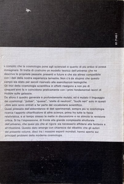 Da allora il quadro generale è profondamente mutato, ed è mutato il linguaggio dei cosmologi: "pulsar", "quasar", "stelle di neutroni", "buchi neri" solo in questi ultimi anni sono entrati a far parte del vocabolario scientifico. Quasi pressata dall'abbondanza di dati sperimentali, sempre più la cosmologia ricerca l'apporto chiarificatore di altre scienze, prima fra tutte la fisica relativistica, e al tempo stesso le mette in discussione e ne stimola la revisione critica. Si ha l'impressione, di fronte alla grande complessità strutturale dell'universo, che quasi più che al rigore sia necessario affidarsi alla fantasia e all'intuizione. Questo dato emerge con chiarezza dal dibattito che gli autori del presente volume, dieci tra i massimi esperti mondiali, hanno aperto sui principali problemi della moderna cosmologia.