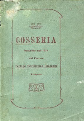 In-8°, pp. 90, (2), brossura editoriale azzurrina protetta da velina con titolo entro bordura tipografica. Tavv. fotografiche f.t. Fioriture lievi. Composto dal parroco e teologo Bartolomeo Mazzone per illustrare la storia e l'arte di Cosseria, cittadina di cui era Arciprete. Cenni sul Castello di Cosseria, sulla difesa di Cosseria del 1796, sulla Bicocca di San Giacomo e l'ode carducciana che la celebra, su Acquafredda, sulle chiese e le parrocchie del circondario, sulle sue opere pie. In fine, un elenco di autori che trattarono di Cosseria.