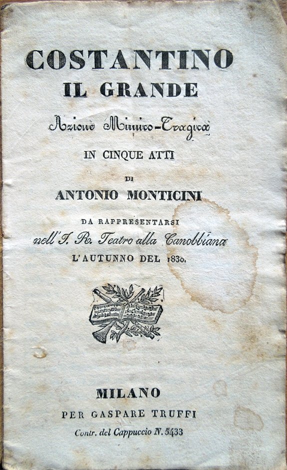 Costantino il Grande. Azione mimico-tragica in cinque atti di Antonio Monticini da rappresentarsi nell'I. R. Teatro alla Canobbiana l'autunno 1830