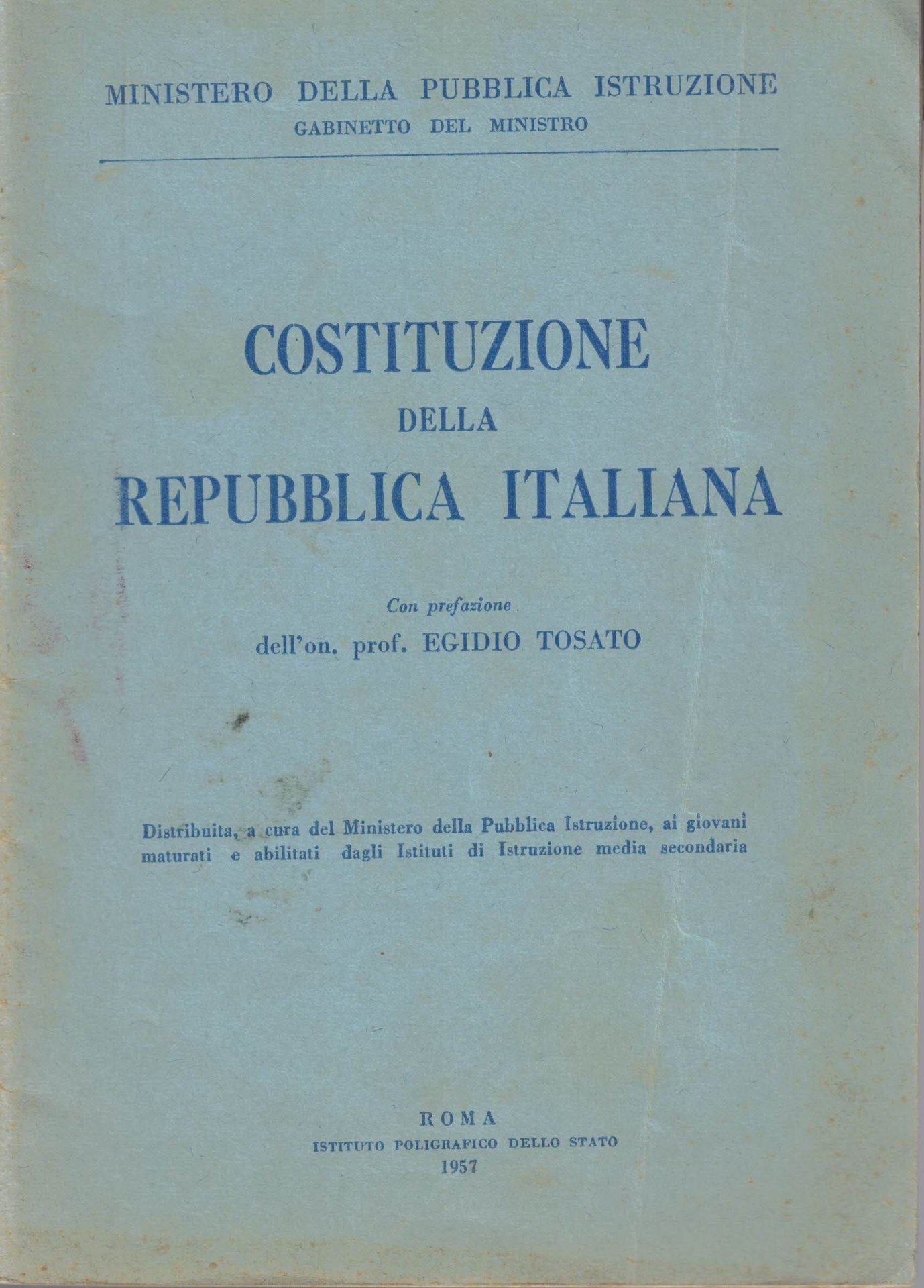 Costituzione della Repubblica Italiana, con prefazione dell’On. Prof. Egidio Tosato, Istituto Poligrafico dello Stato, Roma 1957, pp. 52, cm 20, pubblicazione spillata. In testa al frontespizio: Ministero della Pubblica Istruzione – Gabinetto del Ministro. In calce al frontespizio: Distribuita, a cura del Ministero della Pubblica Istruzione, ai giovani maturati e abilitati dagli Istituti di istruzione media secondaria. Leggere tracce d’uso alla copertina, minime fioriture, per il resto ben conservato, interno ottimo.
