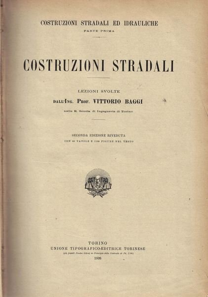 Costruzioni stradali. Lezioni Svolte dall'Ing. Vittorio Baggi nella R. Scuola di Ingegneria di Torino. Seconda edizione riveduta con 45 tav. e 1109 figure nel testo. Unione tipografica editrice Torinese, 1926. Rilegato, pp. 607+ 45. Collana costruzioni stradali ed idrauliche parte prima