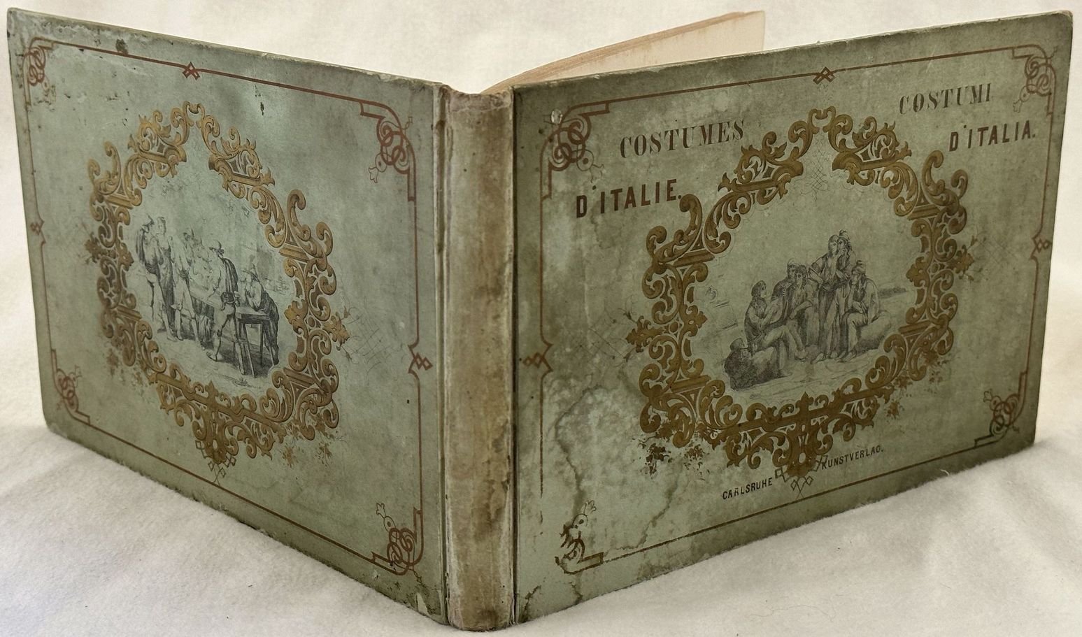 Raro volume, una raccolta di 50 incisioni sui costumi d'Italia edito da Carlsruhe Kunstverlag. Senza data ma del 1850 circa. Le incisioni, molte delle quali protette da velina, mostrano scene di vita quotidiana in diverse zone d'Italia: Napoli e Regno di Napoli, Roma (gioco della morra, serenata, lite di Trasteverini, Teatro dei burattini, Vignareti, Pecorari, zingara indovina, Friggitore, Ballo dell'orso, Gioco di Boccia,Saltarello), Abruzzo (Schiavi, costumi in generale, Casalbordino a l'Aquila), Sezza, Nizza, Tivoli, Frascati (eremita che fa baciare una reliquia), Albano, Lugano, Genova, Venezia, Milano ecc. Le tavole sono state incise da diversi autori non sempre indicati: Mofsbrugger, W. Gail. Dedica alla prima carta bianca datata 1858. In buone condizioni. Copertina editoriale decorata in buone condizioni con lievi usure marginali. Legatura in buone condizioni. Pagine in buone condizioni generali con fioriture. In 8. Dim. 15x23 cm. Pp. (50).Scarce volume, a collection of 50 engravings about costumes of Italy edited by Carlsruhe Kunstverlag. Not dated but of 1850 circa. The engravings, many of them protected by tissue paper, show scenes of daily life in different areas of Italy: Napoli e Regno di Napoli, Roma (gioco della morra, serenata, lite di Trasteverini, Teatro dei burattini, Vignareti, Pecorari, zingara indovina, Friggitore, Ballo dell'orso, Gioco di Boccia,Saltarello), Abruzzo (Schiavi, costumi in generale, Casalbordino a l'Aquila), Sezza, Nizza, Tivoli, Frascati (eremita che fa baciare una reliquia), Albano, Lugano, Genova, Venezia, Milano ecc. The plates have been engraved by different authors not always indicated: Mofsbrugger, W. Gail. Dedication in the first blank page dated 1858. In good conditions.Editorial decorated cover in good conditions lightly worn in the extremities. Binding in good general conditions.Inside pages are in good conditions with foxing. In 8. Dim. 15x23 cm. Pp. (50).