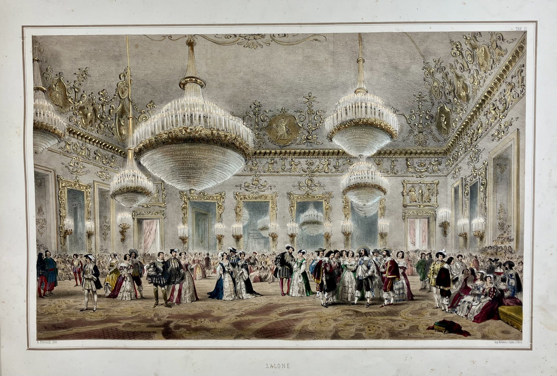 Splendida e rara opera in cui sono raffigurati i personaggi che presero parte al ballo dato da re Ferdinando II nella sua reggia di Napoli durante il Carnevale del 1854. Fu un evento memorabile: dal 20 al 27 febbraio il Palazzo Reale di Napoli fu un ininterrotto splendore di luci, di suoni, di canti e di pietre preziose, perché il ballo in maschera venne replicato per almeno quattro sere; fu deciso che la scenografia si ispirasse ai costumi della corte di Luigi XIII di Francia e di quel Richelieu che il re di Napoli ammirava in modo particolare, considerandolo probabilmente il campione assoluto dell’Ancien Régime. Le tavole di questa edizione furono disegnate da Luigi Marta, e incise in litografia da Provost, Lacauchie, Coindre, Donjean, Lamy, Henry Emy, Greppi, Grenier, Janete, Loutrel Hue e Didier.