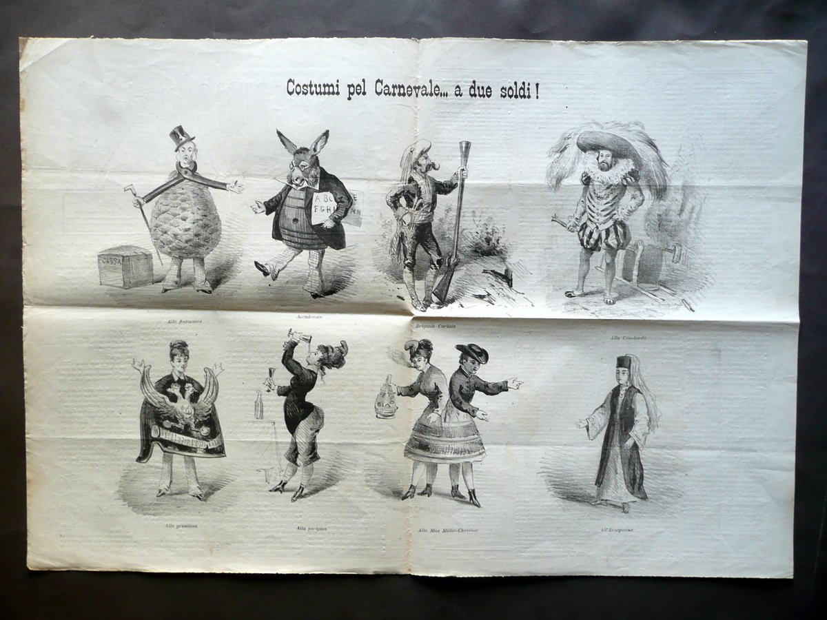 Periodico, Costumi pel Carnevale. a due soldi!" Bella tavola in bianco e nero fuori testo in "Don Pirloncino" Anno VI - Numero 12 Roma, 28 Gennaio 1876 Roma 1876, cm 40x29,5, pp. 4 (bifolio), con una grande bella ill. in b/n fuori t. (vedi foto); bella intestazione ill. in b/n. Numero completo. Condizioni di conservazione Esemplare ben conservato con tracce d'uso, piega centrale di conservazione, poche minime bruniture; angolo sup. della prima pagina con lievi tracce di piccole pieghette. Numero completo. SC03.D11665 N "