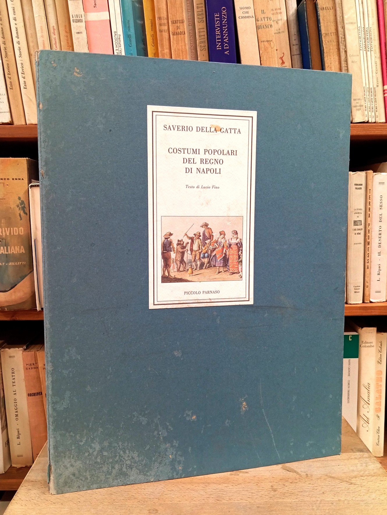 Serie "Piccolo Parnaso", 8. Tiratura di 499 esemplari stampati su carta Tintoretto delle cartiere Fedrigoni di Verona, natale 1992 - Cartella editoriale rigida (31 x 41 cm circa) contenente 35 pagine in quartini sciolti con 24 illustrazioni nel testo di Lucio Fino, cui seguono 25 splendide tavole a colori applicate. Solo cofanetto presenta segni d'uso e del tempo, mentre il contenuto risulta perfettamente conservato -- INDICE: Introduzione - Le prime rappresentazioni dei costumi popolari delle provincie del regno di Napoli - La reale ricognizione dei costumi del regno di Napoli - Le raffigurazioni dei costumi popolari nell'età romantica - I costumi popolari nei dipinti di Saverio Della Gatta - Elenco delle figure - Elenco delle tavole.