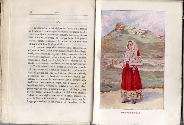 >in-16, pp. 313 (1), con tavole in cromolitografia f.t., bella broch. edit. figurata a colori con vignetta di costumi sardi. Edizione tascabile di una delle più accurate opere dedicate ai costumi regionali della Sardegna, che seguì l'originale in-folio del 1898. Le dieci tavole in vivaci colori, una per ciascun capitolo, rappresentano i costumi festivi di varie località sarde: Osilo Fonni, Quarto S. Elena, Desulo e Aritzo, Iglesias, Sennori, Atzara, Ploaghe, Cabras e Porto Torres. Il vasto testo offre molte e preziose informazioni sui vari capi d'abbigliamento del costume locale, oltre ad interessanti cenni folkloristici sui paesi citati. Ottimo esemplare, firma di possesso al frontespizio.