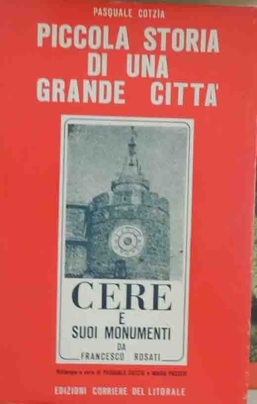 Pasquale Cotzia, Piccola storia di una grande città, Edizioni Corriere del Litorale, s.l. (ma stampato a Ladispoli, Roma, presso le Arti Grafiche Lauria) 1978, pp. XIX, 137, 8 c. di tavv. f.t. ill. b.n., cm 25, br. ed. Numero monografico del Corriere del Litorale. Periodico di Antopologia Regione Lazio. Il volume ripropone la ristampa dell’opera Cere e i suoi monumenti, di Francesco Rosati, nell’edizione pubblicata a Foligno nel 1890 per i tipi del Premiato Stabilimento F. Salvati. La presente riedizione è stata curata da Pasquale Cotzia e Maria Passeri. Titolo al dorso: Francesco Rosati, Cere e isuoi monumenti, ristampa a cura di Pasquale Cotzia e Maria Passeri. Tioli al frontespizio: Pasquale Cotzia, Piccola storia di una grande città / Francesco Rosati, Cere e i suoi monumenti, ristampa a cura di Pasquale Cotzia e Maria Passeri. Minime tracce d’uso alla brossura, una macchiolina alla seconda di copertina, leggera brunitura al margine della quarta di copertina, lieve ingiallitura della carta, per il resto buona copia.