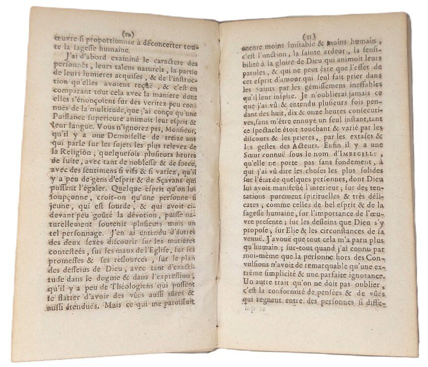 >in-16, pp. 36, cartonato muto del '900. Fregio al titolo, testatine e iniziali silogr. Prima edizione di questo trattato anonimo variamente attribuito al Boyer o a Julien de Gennes. Importante lavoro dedicato al tema della natura delle convulsioni mistiche che infiammò i giansenisti tra 1730 e 1740, tanto che al loro interno si crearono varie correnti e scissioni. ''Les règles du discernement sont évidemment extrêmement mouvantes, car laissées en quelque sorte à l'appréciation de chacun, de sorte que d'Etemare est rapidement dépassé par certains de ses disciples. Ils entreprennent de repousser la frontière et de diviniser les « voiles ». C'est en particulier le cas d'un chanoine de Laon, Jacques Gudvert, et des pères oratoriens Pierre Boyer et Julien de Gennes'' (Catherine Maire Les querelles jansénistes de la décennie 1730-1740). Ottimo esemplare. Barbier I 783.