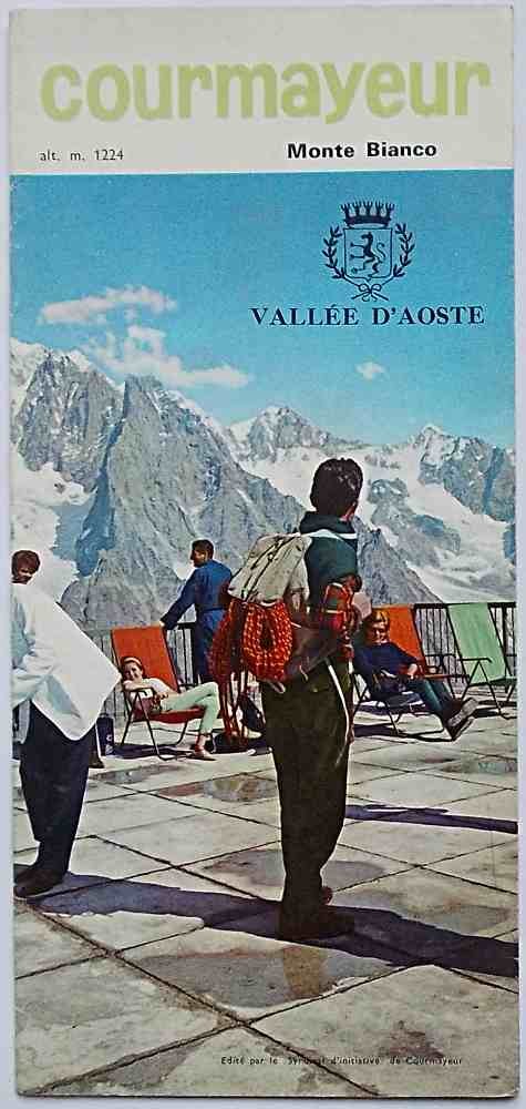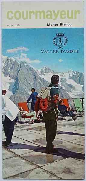 Pieghevole di 12 facciate di cm. 24 x 11 con due panorami a volo d'uccello di Oberbacher (estivo e invernale), ciascuno su tre facciate e numerose illustrazioni fotografiche a colori. Copertina fotografica. (Cameriere in giacca bianca e papillon che serve turisti sulla terrazza dell'Arp, con Monte Bianco sullo sfondo!). VG. ** Testo in inglese.