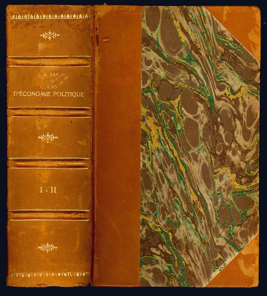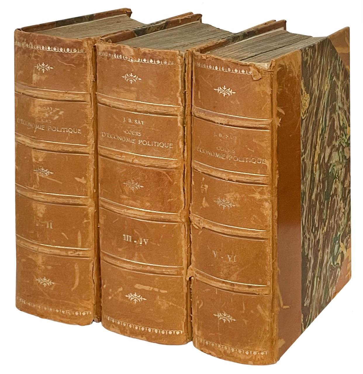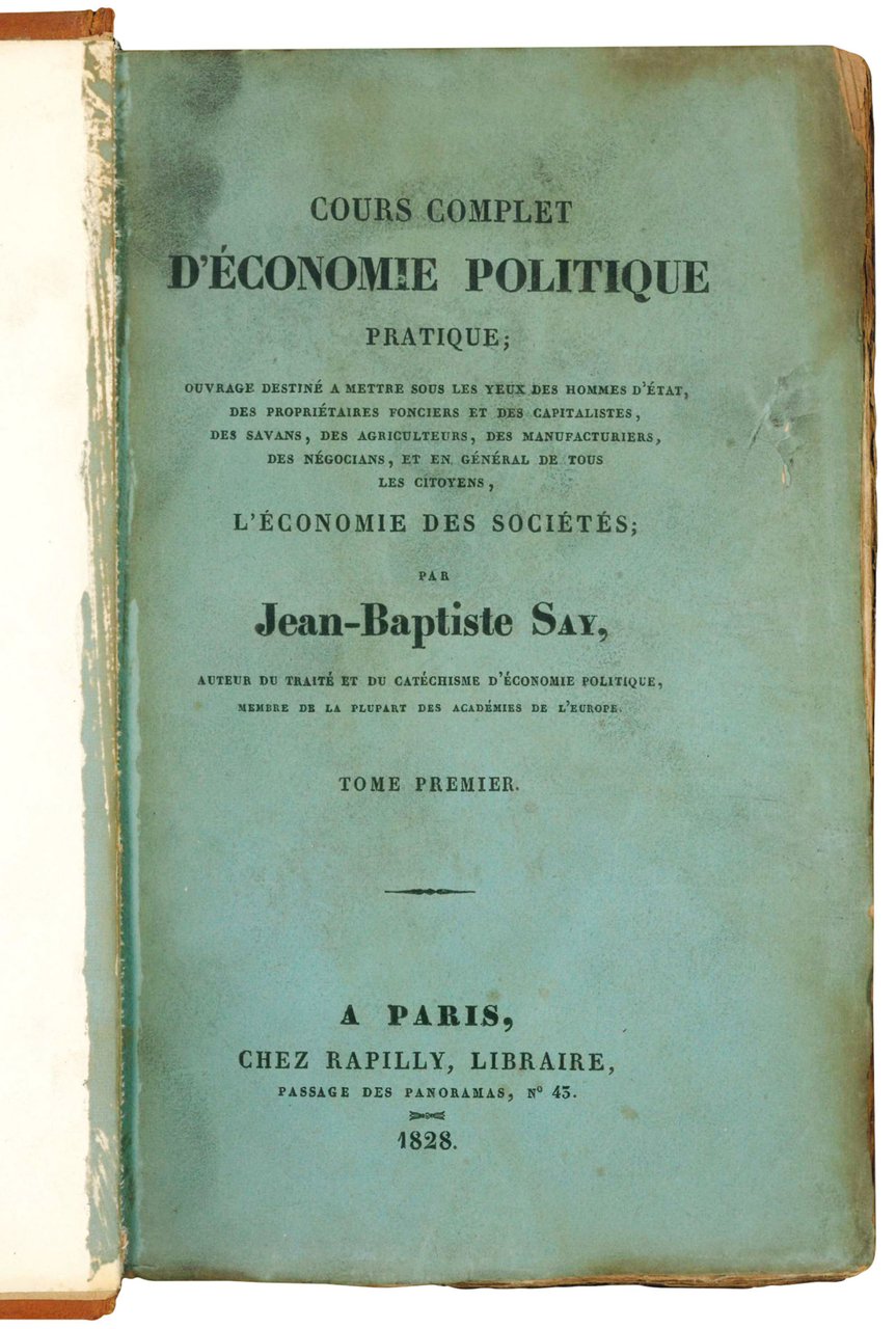 PRIMA EDIZIONE. In quest'opera Say riprende e ridefinisce i principi enunciati nel Traité. L'opera si basa fondamentalmente sui corsi che egli tenne presso il Conservatoire des Arts et Métiers ed ebbe grande successo, pur suscitando le proteste dei protezionisti, che ne contestavano le idee troppo liberali. «The most important of the links in the chain that leads from Cantillon and Turgot to Walras» (Schumpeter).