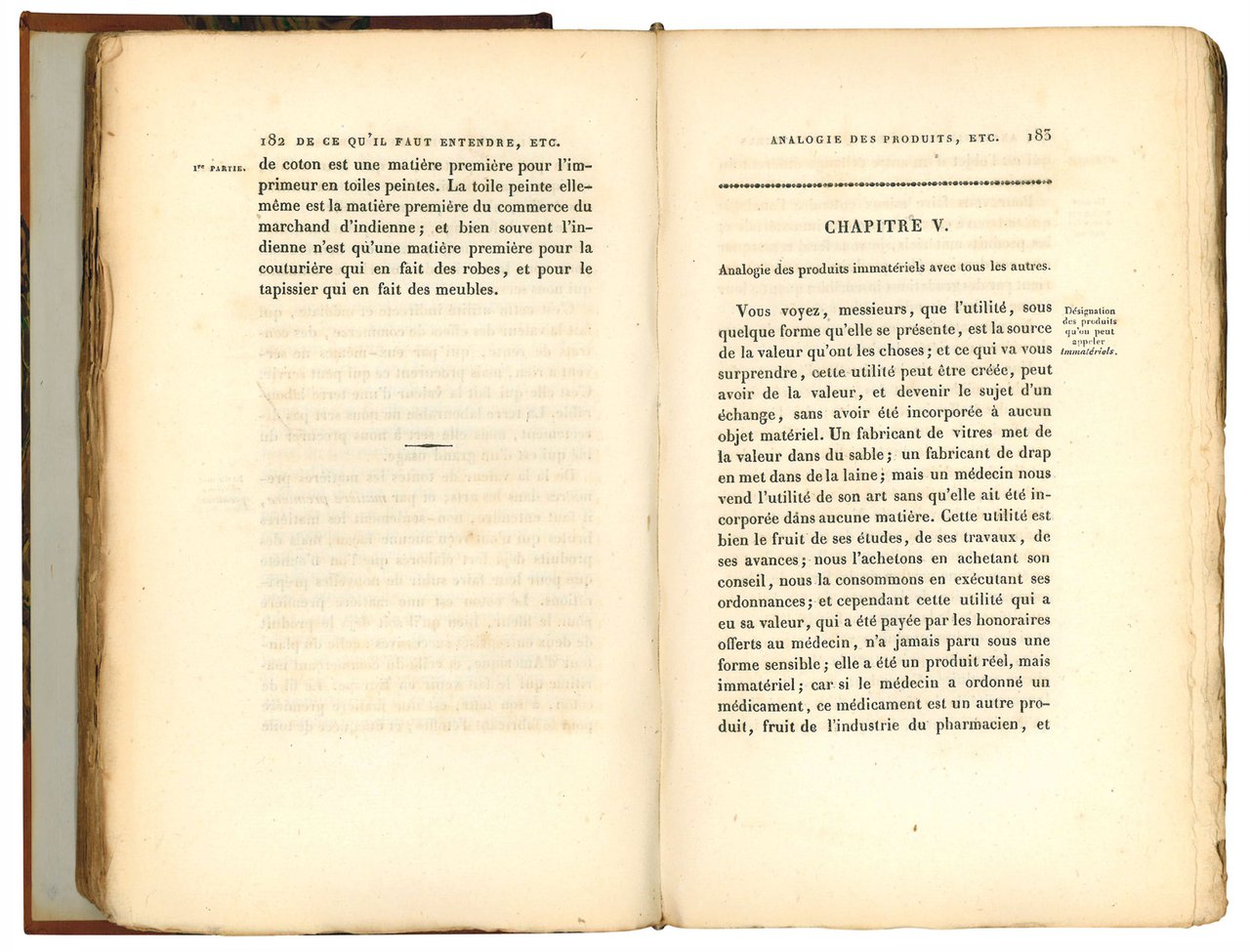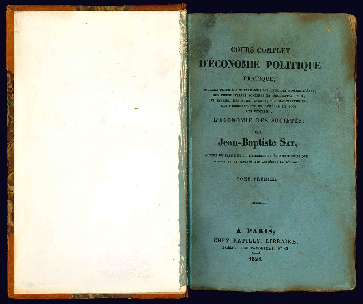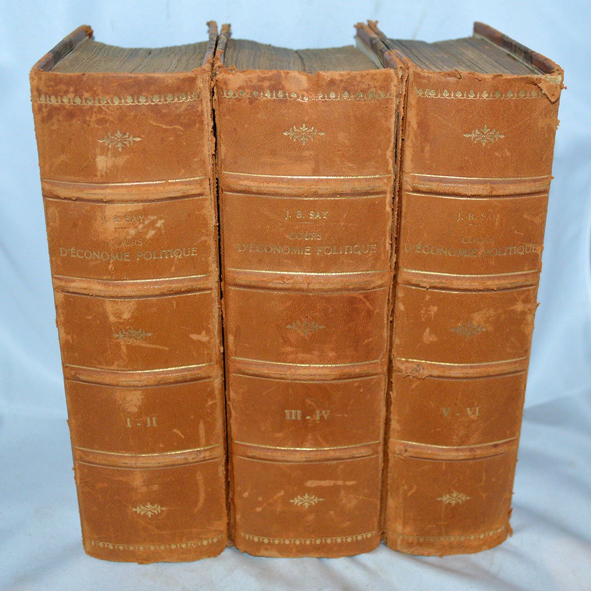 PRIMA EDIZIONE. In quest'opera Say riprende e ridefinisce i principi enunciati nel Traité. L'opera si basa fondamentalmente sui corsi che egli tenne presso il Conservatoire des Arts et Métiers ed ebbe grande successo, pur suscitando le proteste dei protezionisti, che ne contestavano le idee troppo liberali. «The most important of the links in the chain that leads from Cantillon and Turgot to Walras» (Schumpeter).