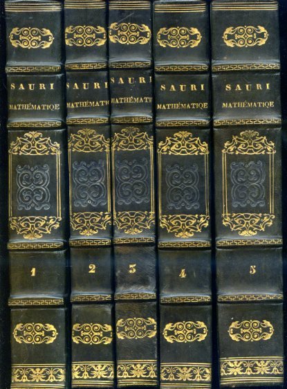 5 volumi in-8° (200x126mm), pp. XXXII, 510; (4), 351; (4), XXXVI, 318, (2); (4), 503; (2), 656; legatura ottocentesca m. pelle verde cupo con titolo, filetti e tomaisons in oro e fregi ornamentali in oro e a secco su dorsi a nervetti decorati in oro. Piatti marmorizzati. Tagli a spruzzo azzurri. Complessive 32 tavv. ripiegate di figure geometriche (al primo vol., 6 tavv. f.t. ripiegate in fine; 8 tavv. ripiegate in fine del secondo vol.; 6 tavv. ripiegate in fine del terzo vol.; 4 tavv. ripiegate in fine del quarto vol.; 8 tavv. ripiegate in fine dell'ultimo vol.). Qualche brunitura e traccia d'umido di poco conto. Bell'esemplare. Edizione originale. L'abate Sauri (Rhodez, 1741-nel Bengala, 1785) fu matematico, fisico, astronomo e professore di filosofia all'Università di Montpellier. Poggndorff, II, col. 754.