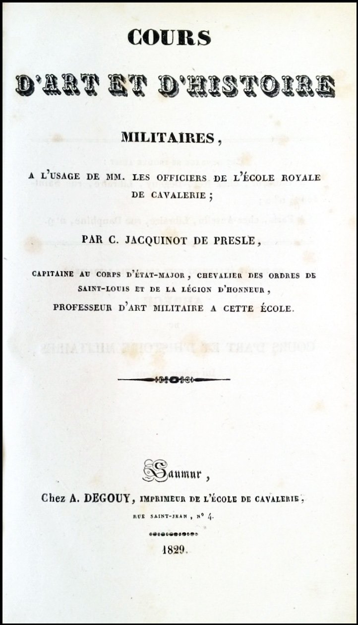 Cours d'art et d'histoire militaires, a l'usage de MM. les officiers de l'Ecole Royale de Cavalierie; par C. Jacquinot de Presle, Capitaine au Corps d'Etat-Major, Chevalier des Otdres de Saint-Louis et de la Legion d'Honneur, professeur d'art militaire a cette ecole.
