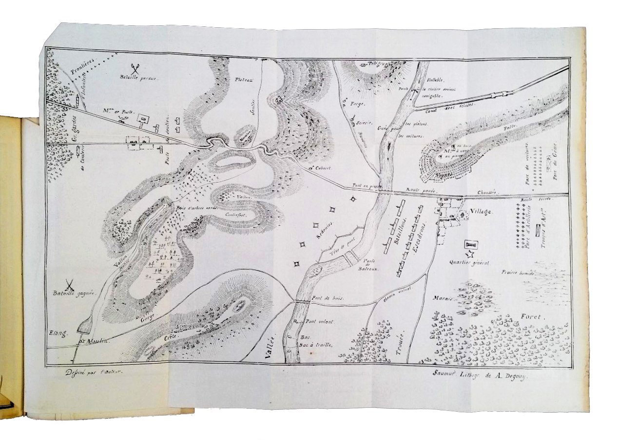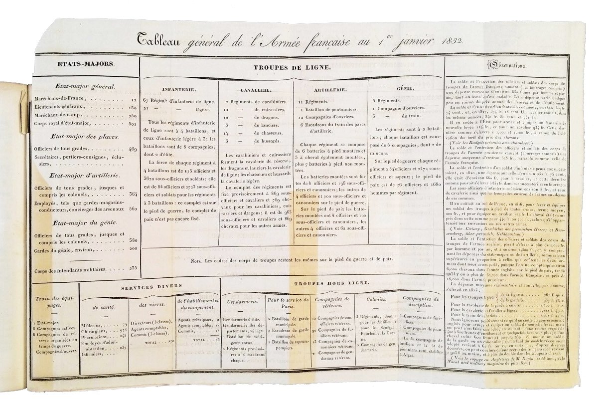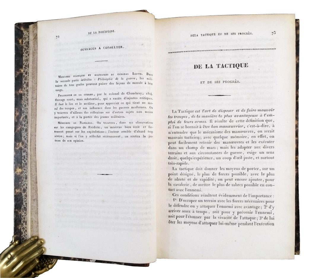 8vo (206x120 mm); leg. in mezza pelle marrone chiara, con dorso a quattro nervi, titolo e decori in oro al dorso, piatti, guardie e tagli marmorizzati; pp. (2), VII, (1), 614; 5 tav. in fondo al testo più volte ripiegate: una tav. incisa sulle due pp., con al recto una tav. generale dell'Armata Francese al 1.1.1832 e al verso una tav. delle istituzioni militari di Francia, una tav. con uno specchio in bianco per note statistiche, tre tavv. con schemi di schieramenti di battaglia e schemi d'attacco (litografie di A. Degouy). Poco diffusa prima edizione di questo corso d'arte e storia militare a cura di Jacquinot de Presle. Prov.: indicazione d'appartenenza riportata all'occhietto in alto a dx con inchiostro blu di un certo R. Gerard in data 19-VII-1953. -- Hardcover, reliure demi veau orné à nerfs, titre au dos. Cours d'histoire et d'art militaire illustré de 5 planches dépliantes. Bel exemplaire. -- Rif.: IT\ICCU\TO0E\106129 (una copia presso la Biblioteca Statale di Cremona). OCLC, 757357774 (una copia in Canada), 750975562 (una copia in Polonia) e 457437364 (2 copie in Francia). Cond.: Opera completa in ottimee condizioni generali. -- Complete copy in very good condition.