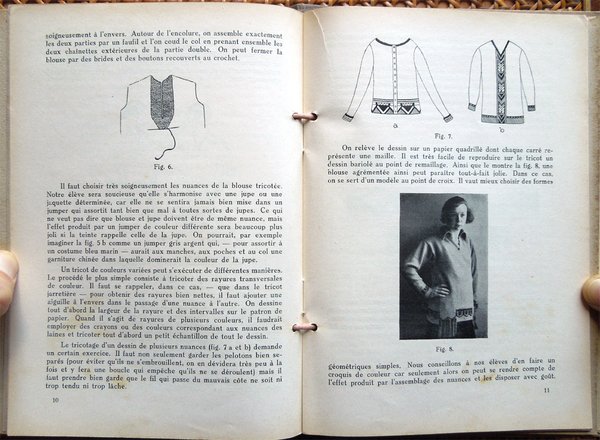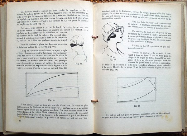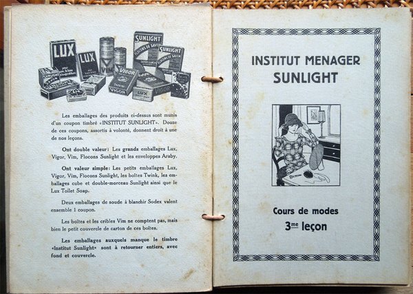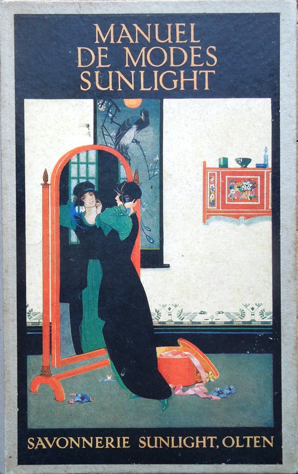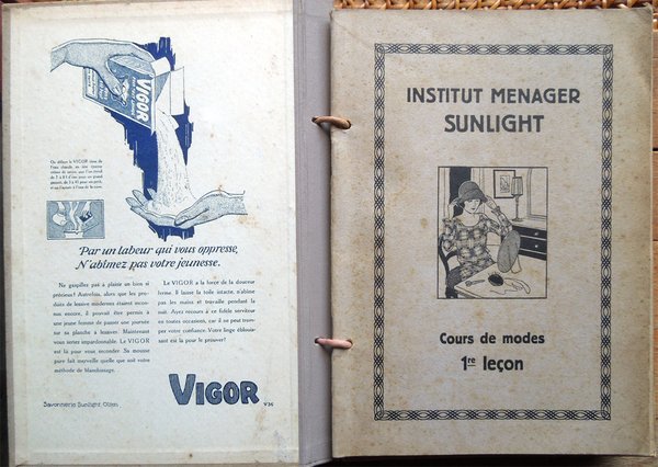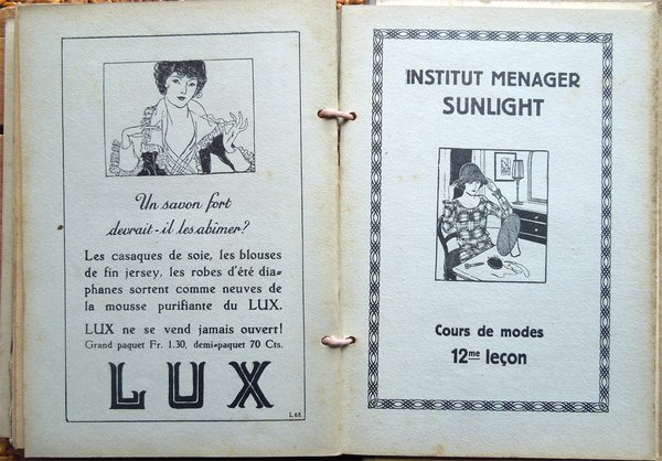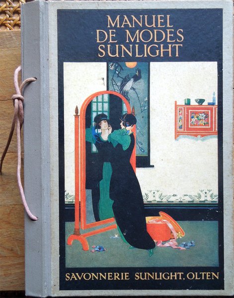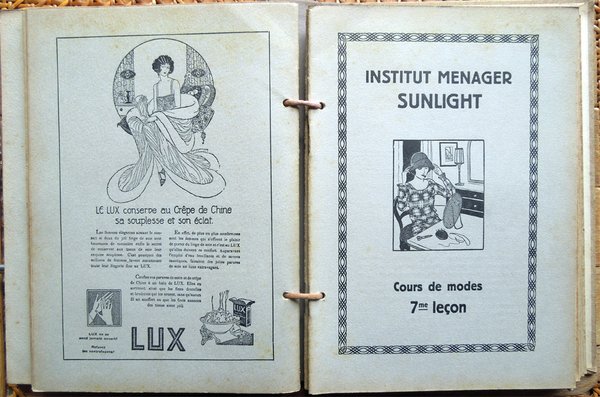 In-8° (20,3 x 14,5 cm), 17 fascicoli di 32 pagine ciascuno (12 fascicoli di lezioni più 5 fascicoli di supplemento alle lezioni), fascicoli, con numerazione propria, rilegati con cordino rosa entro cartella editoriale in tela grigia, cartella con ai piatti applicate due differenti immagini a colori su carta. Titoli al piatto anteriore: Manuel de modes Sunlight Savonnerie Sunlight, Olten. Con molte illustrazioni in bianco e nero nel testo raffiguranti, in prevalenza, schemi per la realizzazione di capi d'abbigliamento ed accessori di moda. Piccoli, normali segni d'uso alla cartella, leggeri segni d'umido alla copertina di alcuni fascicoli, per il resto ben conservato. Dettaglio dei fascicoli: 1re leçon. Introduction. Les quatre qualités essentielles d'un chapeau seyant: exactitude de l'entrée de tête, élégance de la forme, harmonie des nuances, perfection minutieuse du travail; Harmonie de la toilette et du chapeau; La mode; Les outils de la modiste et leur but: épingles, aiguilles, dé, ciseaux, ruban métrique, pince à laiton, fer, coussin à repasser; Entretien de la machine à coudre; Les points que la modiste doit connaître: le point devant, le point de fronce, les points de faufil (droit et oblique), le point arrière, le point caché, le point de surfilage, le point noué, le point perdu, le point lancé, le point de boutonniére, le point de surjet, le point de chausson, le point de noeud, le point de chaînette, etc.; Un modèle de coiffure pouvant servir de bonnet d'auto, de chapeau de pluie ou de sport. Supplement 1re leçon. Raccomodages; Le raccomodage du linge; Le rapiécetage; La pose d'une pièce ronde; Les raccomodages dans la lingerie fine; Raccomodage des draps de lit; Raccomodage des chemises d'hommes. Ravaudages. Le reprisage à la main; Les reprises à la machine; Ravaudage du tricot; Ravaudage des mailles usées; Ravaudage des mailles à l'endroit; Ravaudage des mailles à l'envers; Ravaudage sur fils tendus; Ravaudage au point de toile et au point de dentelle; La remailleuse «Clapa». 2me leçon. Materiaux employés dans la confection de la forme-type: trait, sparterie, linon, tulle raide, mousseline, barège; Manière de prendre l'entrée de tête; Confection d'une forme simple (cloche à calotte arrondie); Grande cloche, à l'aile légèrement relevée pouvant être portée par une personne de petite taille; Comment renforcer les ailes très larges ou troup souples?; Comment relever le patron d'un modèle simple?; Comment dessiner un patron d'aile en papier?; Forme d'une petite cloche. Supplement 2me leçon. Pièces rapportées à la maille dans les différentes parties du bas; Talon rapporté; Pièces rapportées: 1. Pièces rapportées sans couture de bord; 2. Pièces rapportées avec couture de bord; 3. Pièces rapportées avec deux coutures de bord; Rapiéçage des bas. Rapiéçage du drap. Comment renforcer les parties usées. Comment poser des pièces; Pièces rapportées au point de surjet; au point caché ou à la machine; Pièces rapportées au point de drap; Raccomodage des bords usés; Les boutonnières des vêtements d'homme; Comment réparer un col de veston ou de manteau. Comment moderniser le linge. La chemise; Le pantalon; La chemise-pantalon; Le jupon; La chemise kimono; La chemise de nuit. Raccomodage des vêtements de soie. Le jour d'incrustation ou jour grec. 3me leçon. Ailes relevées; Comment remédier aux cassures de la sparterie; Ailes tombantes; Diverses calottes de sparterie; Formes de calottes qui conviennent à des tours de tête spécialement forts; Calottes souples. Calottes à pièces rapportées; Transformation des calottes de linon; Comment on peut modeler des ailes relevées à l'aide d'un biais de sparterie humectée. Supplement 3me leçon. 1. La Broderie; 2. Les Jours. Jours rivières; Jours perses; 3. Points de broderie; 4. Broderie blanche. Le plumetis; La Broderie flore; La Broderie anglaise; Le Feston; 5. Le Monogramme; 6. La Broderie sur tulle; 7. Le Filet. 4me leçon. Chapeau «genre toque»; La forme turban; Le marquis ou tricorne; Le matériel; Comment recouvrir les chapeaux cloches; Comment recouvrir les formes turban; Comment recouvrir les ailes relevées. 5me leçon. Comment recouvrir les ailes plates d'un tissu uni; Comment border une aile d'un biais uni ou froncé; Manière de recouvrir tout un chapeau de tissu bouillonné; Chapeaux drapés; Comment tendre, sur les ailes relevées: a. un revêtement fait de biais cousus; b. un tissu que l'on colle; L'étroit ruban de faille comme bordure d'aile; Comment poser un revêtement de panne; Chapeaux recouverts de ruban ou de galons de paille. 6me leçon. La forme de laiton; Revêtement de tulle de la carcasse; Le chapeau de dentelles; Le chapeau de crêpe Georgette; Comment recouvrir la forme de barège; Le chapeau d'organdi; Combinaison de nuances. 7me leçon. Chapeaux de sport; Le chapeau de cuir; Béguins d'enfants; Souples chapeaux d'enfants; Chaussons de bébé. 8me leçon. Chapeaux de fillettes; Casquette de sport pour messieurs et garçonnets; Les cravates de messieurs; Chapeaux pour dames âgées; La coiffe (doublure) du chapeau; Chapeaux de deuil; Le voile de mariée; Le bonnet du matin. 9me leçon. Comment rafraîchir les fournitures; Transformation des ailes; Transformation des calottes; Différentes sortes de cocardes, rosaces et noeuds; Variétés de fleurs d'étoffe et de ruban. Supplement 9me leçon. Coussins et rouleaux tricotés; Coussin rond au crochet; Tricot double (tricot anglais); Crochetage à boucles; Broderie au point plat sur tissu gaufré; Kélim; Dentelle à la fourche; Point de Smyrne; Applications; Broderie au point de Hongrie; Le gilet; Châle léger, simple et élégant; Culotte de dame; Jupon tricoté; Pèlerine d'enfant au tricot; Jaquette d'enfant au crochet tunisien; Jaquette d'enfant en ratine quadrillée; Poupée tricotée; Napperons de toile à bordure de couleur au crochet. 10me leçon. Considérations générales sur l