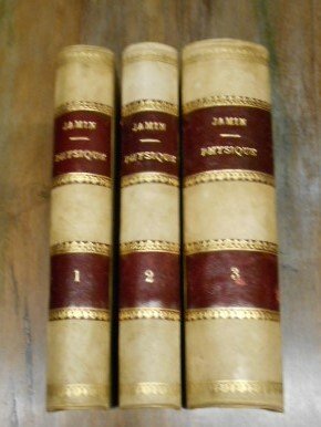 (Scienza - Fisica - Fisici francesi dell'Ottocento) Tre volumi in 8°, legatura coeva in mezza pergamena, al dorso filetti dorati e doppio tassello in pelle rossa con titoli in oro, ai piatti carta marnorizzata monocroma. Volume primo : Mallet-Bachelier, 1858, pp. XVI,532, con 270 figure nel testo ed una tavola ripiegata in fine. Volume secondo : Mallet-Bachelier, 1859, pp. XII,532, con 191 figure nel testo e tre tavole ripiegate in fine. Volume terzo : Gauthier-Villars, 1866, pp. XVI,804, con 480 figure nel testo e sei tavole ripiegate in fine.Tutte le tavole sono incise in acciaio. Qualche leggera traccia di ossidazione ma volumi solidi e ben conservati.
