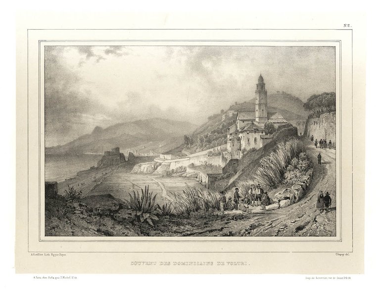 >Litografia (cm. 30x43) eseguita da A. Cuvillier su disegno di Nicolas Chapuy, tratta dalla raccolta: Promenade de Nice à Gênes dessinée d'après nature par Chapuy et lithographiées par Cuvillier, Deroy, J.C. Joly, Monthelier, Tirpenne. Paris, Bulla, Sans année (ma 1837). Esemplare in perfetto stato di conservazione.