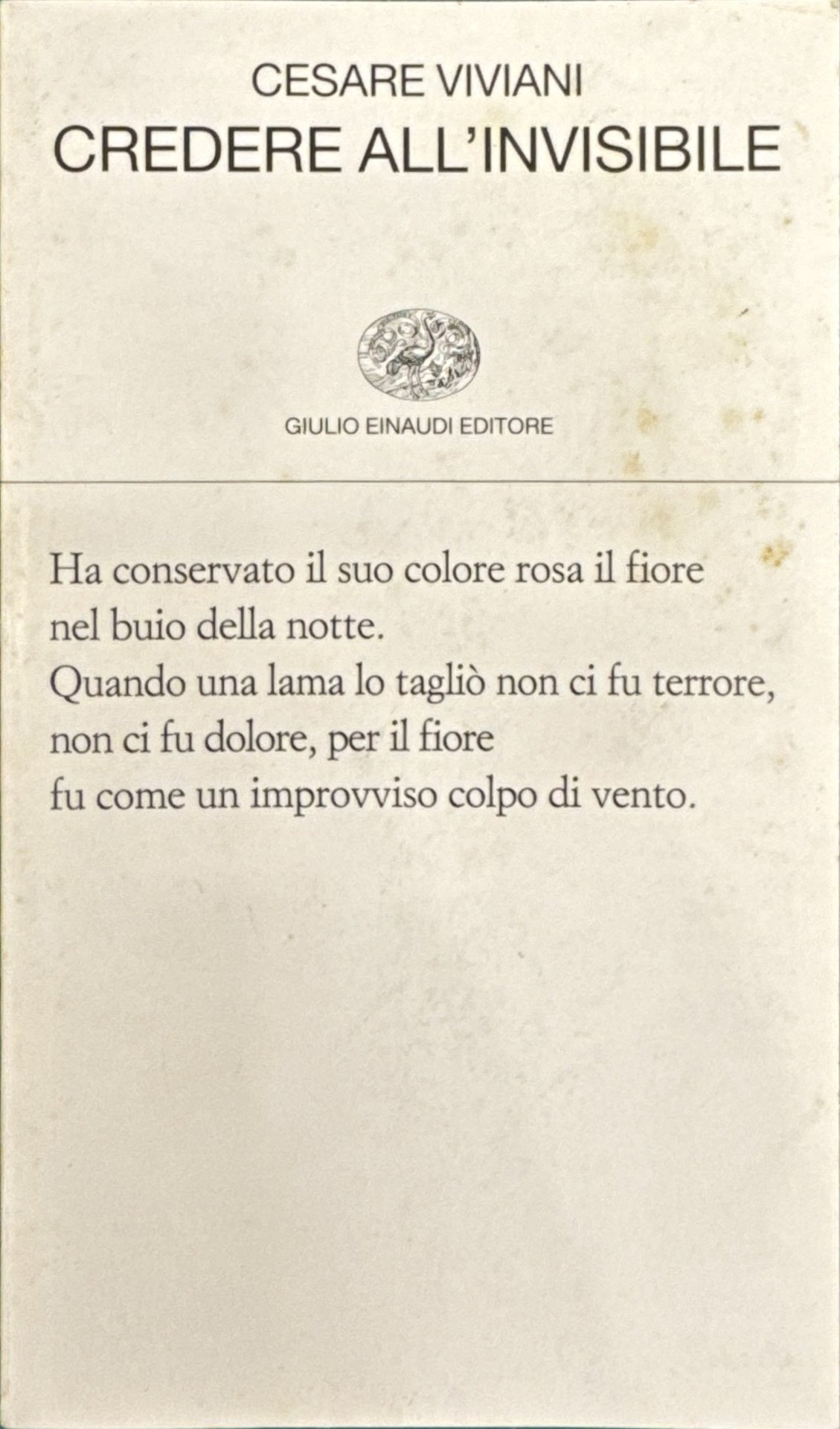 Con questa sua nuova raccolta Cesare Viviani fa un passo ulteriore nel percorso di ascolto e di meditazione che caratterizza i suoi ultimi libri. La forma è più immediata. Sono poesie brevi, con una sola voce, affabile e colloquiale anche nel proporre temi elevati, come i limiti dell'umano, la pulsione all'autenticità, il confronto con l'angoscia della fine. L'"invisibile" di Viviani non è qualche cosa di trascendente, ma è ciò che, innervato nella concretezza della natura, resta indecifrabile, incomprensibile, irriconoscibile. E dunque credere, più che l'oggettivazione di una fede, è rispettare, accettare, affidarsi alla vita. In questi versi diretti e spesso sorprendenti per clausole inattese, la via maestra è l'umiltà: rinunciare alla presunzione umana significa trovare il giusto posto di se stessi e delle cose, e sapere che tutte le esperienze, anche quelle estreme, fanno parte di un ciclo e non hanno niente di eccezionale: sono natura. Sotterranea e parallela al discorso cosmico-esistenziale, scorre una riflessione poetica in cui il medesimo atteggiamento interiore vede con distacco ogni ironia narcisistica e abilità verbale: perché un animale nel suo habitat - dicono i versi di una poesia significativamente dedicata a Mario Luzi - è più vicino all'"invisibile" di qualsiasi ambiziosa invenzione letteraria.// Cop. in brossura; Einaudi 2009; copertina con segni di gora; nel complesso buona copia