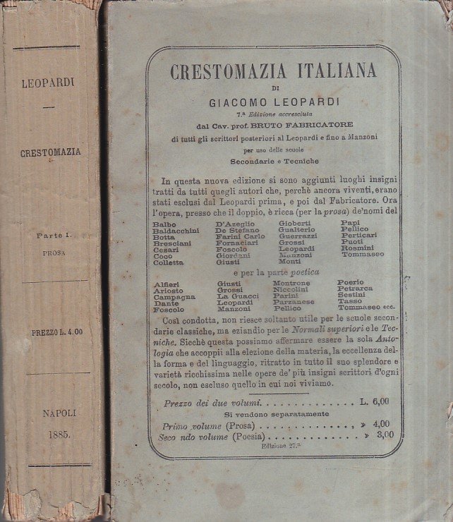 Crestomazia italiana cioè scelta di luoghi insigni o per sentimento e per locuzioni, raccolti dagli scritti italiani, di autori eccellenti di ogni secolo. Settima edizione emendata ed accrescita per cura di Bruto Fabbricatore. Parte prima: Crestomazia prosaica. Parte seconda: Crestomazia poetica